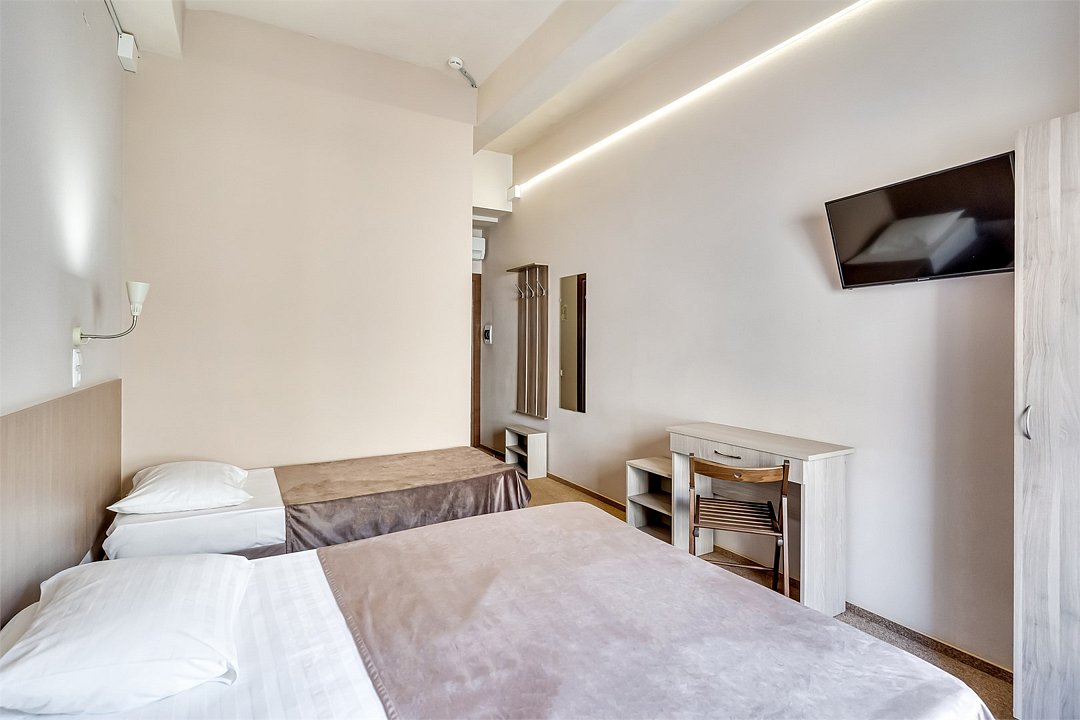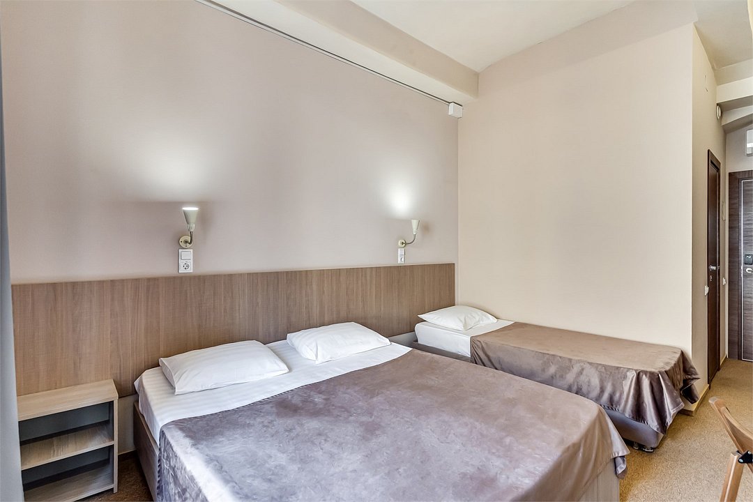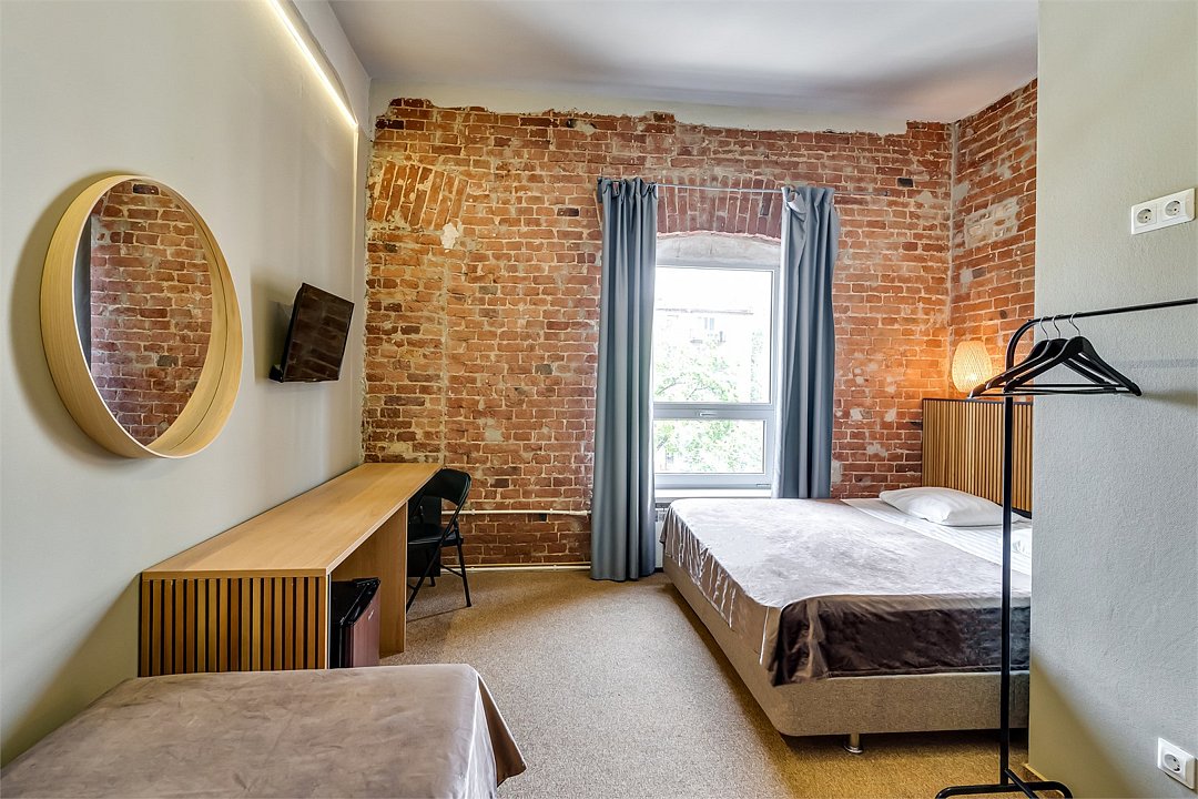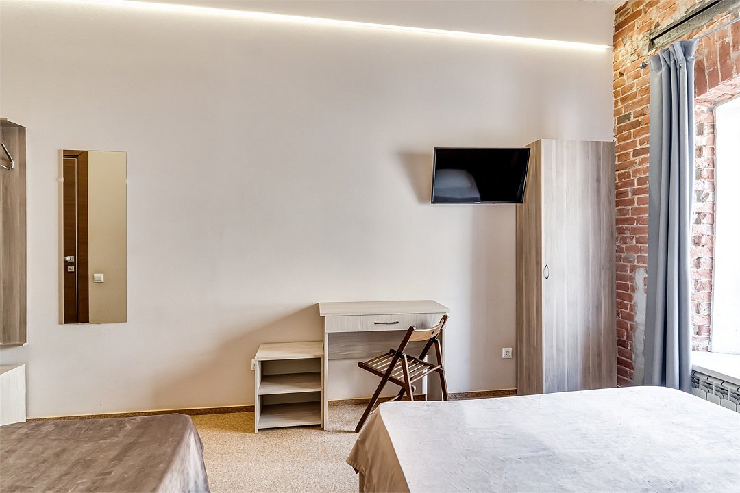 СТАНДАРТ трехместный с собственной ванной комнатой - это номер, в котором комфортно может разместится 3-е человек. В номерах данной категории одна большая двуспальная кровать (160 см. х 200 см.) и одна односпальная кровать (80 см. х 200 см.) или три односпальные кровати (80 см. х 200 см.). Санузел находится в номере. Каждому гостю предоставляется комплект из 2-х полотенец. В номере телевизор. На всей территории отеля бесплатный WI-FI. В Лофт-отеле "Набоков" оборудована просторная и уютная кухня-столовая, где можно приготовить еду, разогреть обед, выпить чашечку кофе или чая, приятно провести время с книжкой. Кофе, чай, сахар - комплимент от Лофт-отеля "Набоков"Услуги и удобства