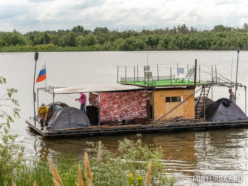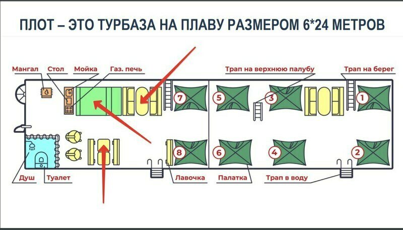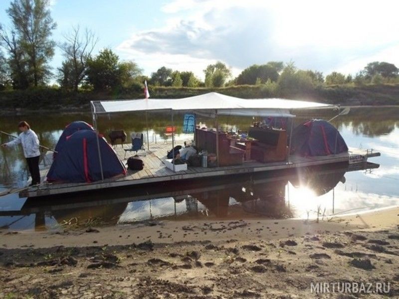 Плот на 8 человека, 4 двухместные палатки с матрасами, зона мангала и зона кухни со всей необходимой посудой, площадь 72м2-нижняя палуба, 24м2-вторая палуба.