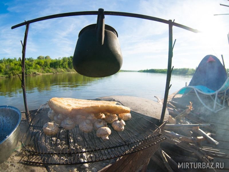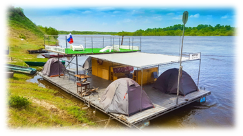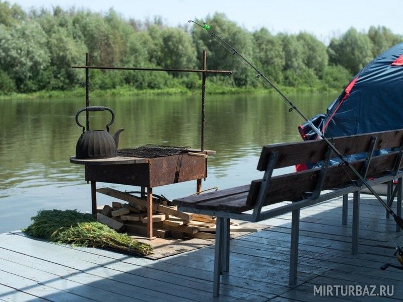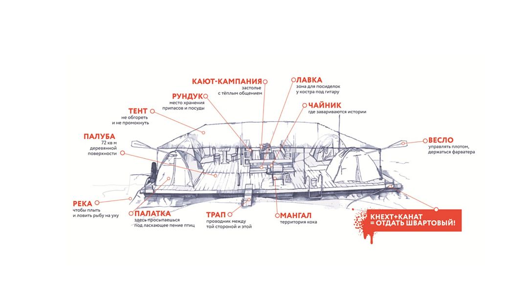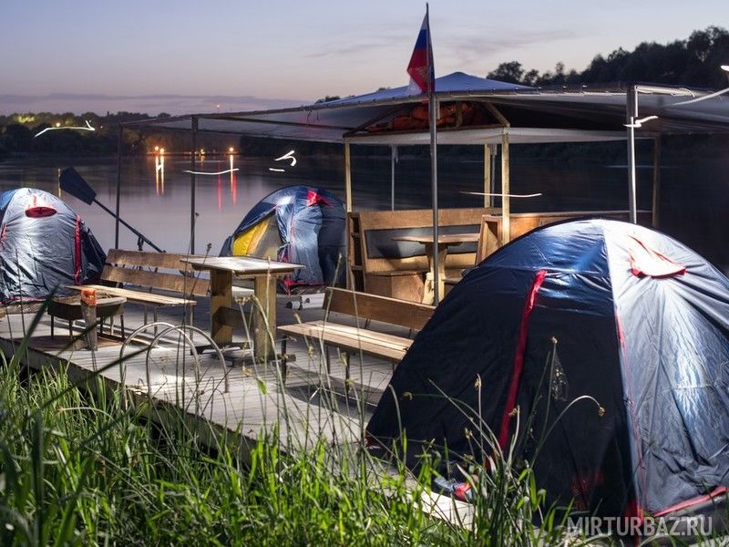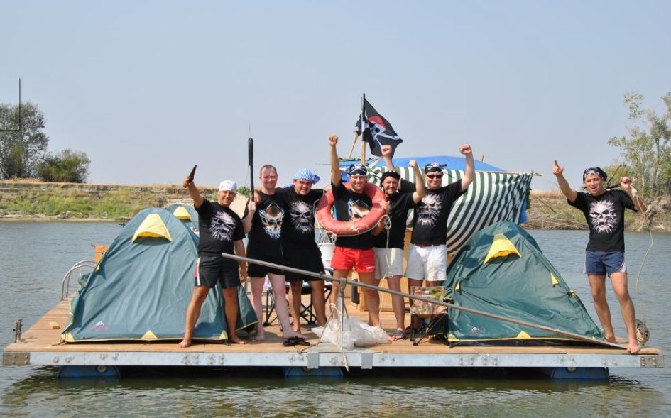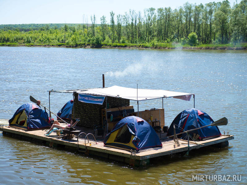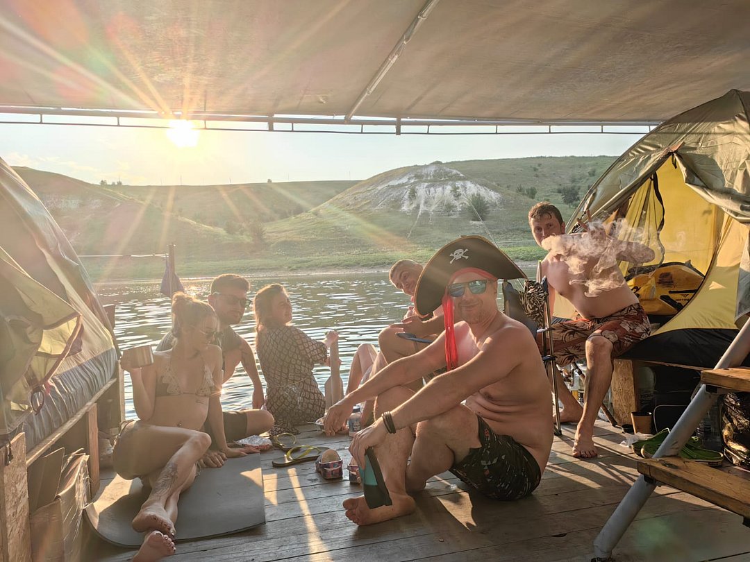 Плот на 8 человека, 4 двухместные палатки с матрасами, зона мангала и зона кухни со всей необходимой посудой, плот накрыт тентом