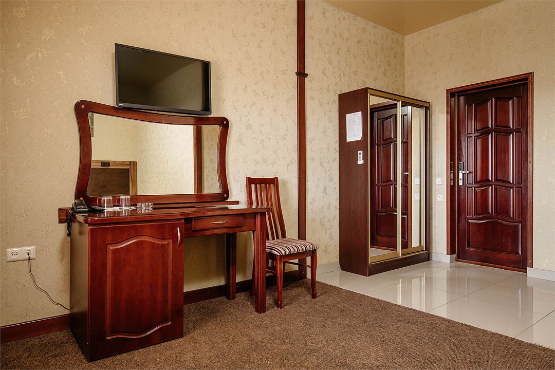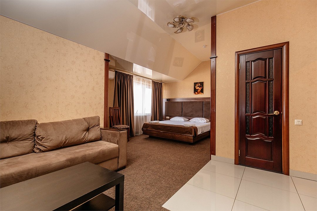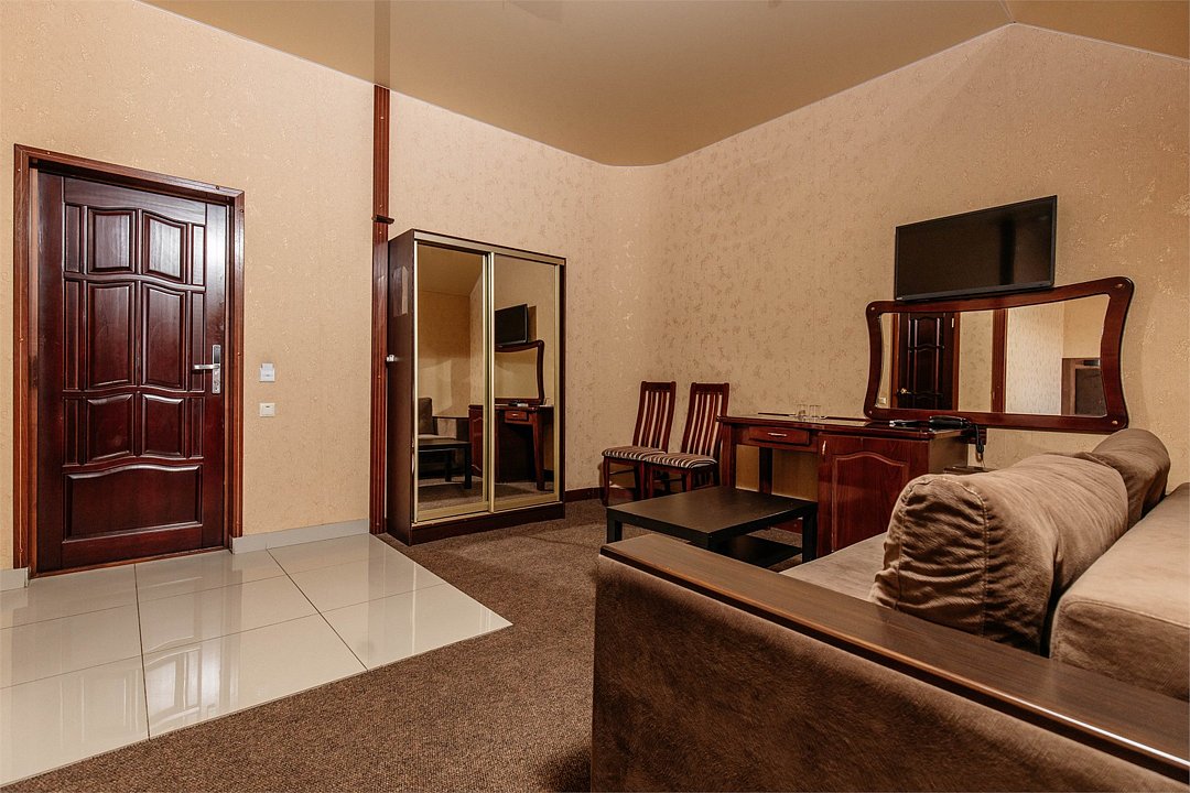 Номер люкс с двумя комнатами, кондиционер, телевизор, внутренний телефон, двухспальная кровать, диван, шкаф, столик, душевая кабина, туалетные принадлежностиУслуги и удобства