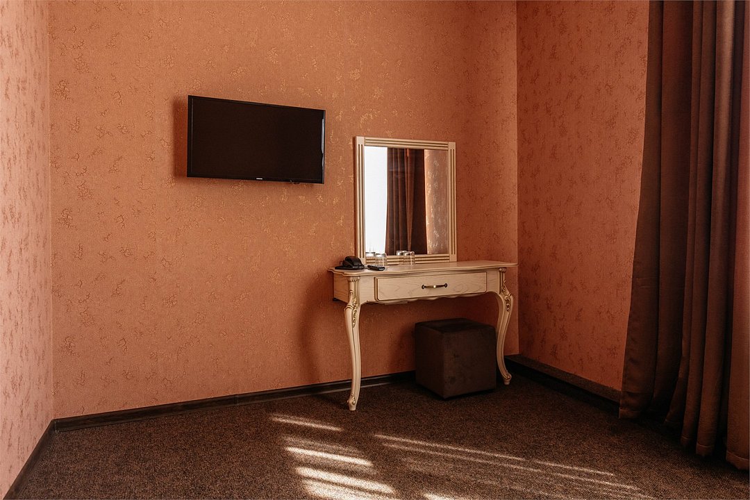 Wi-Fi, кондиционер, светильник, фен, система безопасности, электронные замки, санузел, банные принадлежности, банные полотенца, тапочки, кровать «Queen size», двуспальная кровать, ортопедический матрас, тумбы, стулья, шкаф для одежды, вешалки, обеденный стол, зеркало, комод, пуфики, унитаз, раковина, мягкая мебель, душ, кулер на этаже, вид во двор, стул, стол, тумба, туалетный столик, туалетные средства, туалет, сплит-система, раскладной диван, внутренний телефон, телевизор с плоским экраном, мини-холодильник, шкаф-купе, вид на бассейн, пуфикВ номере