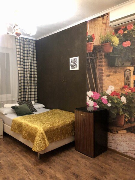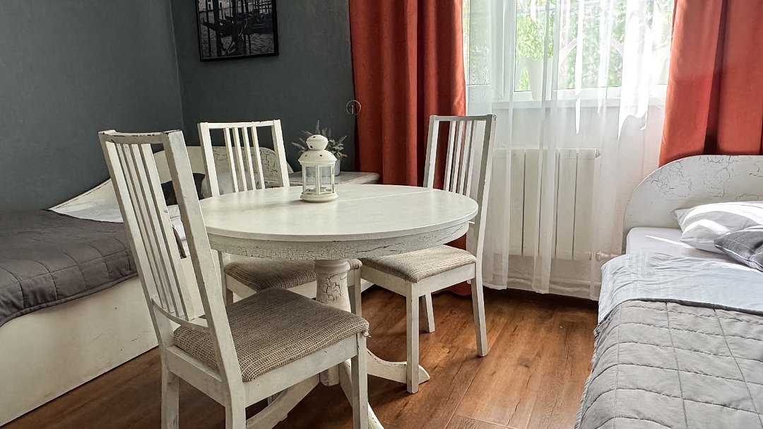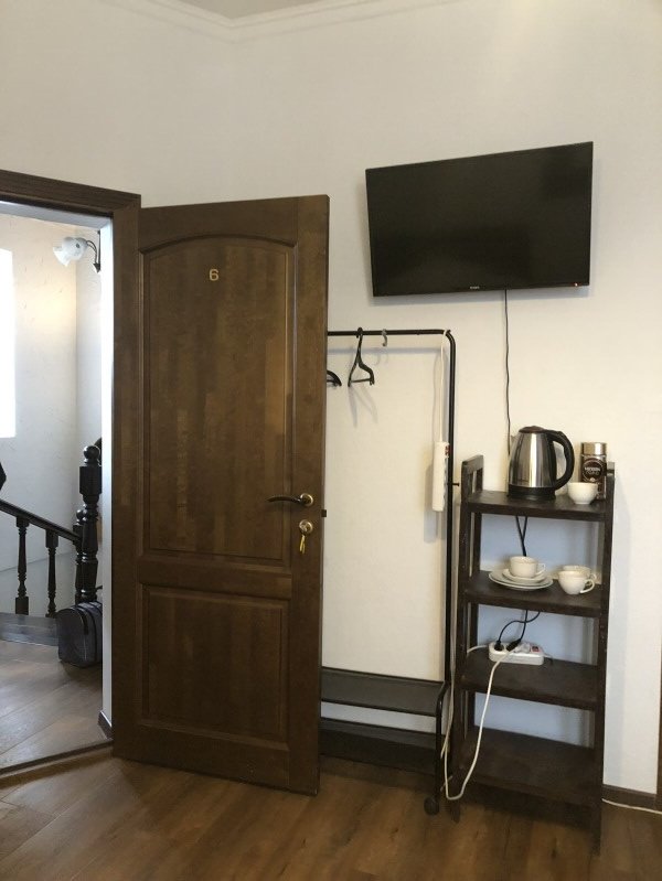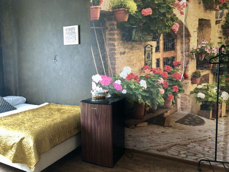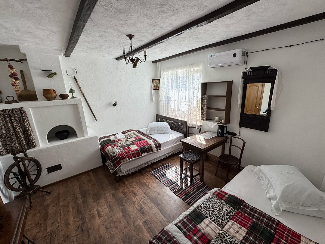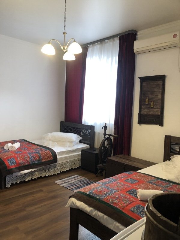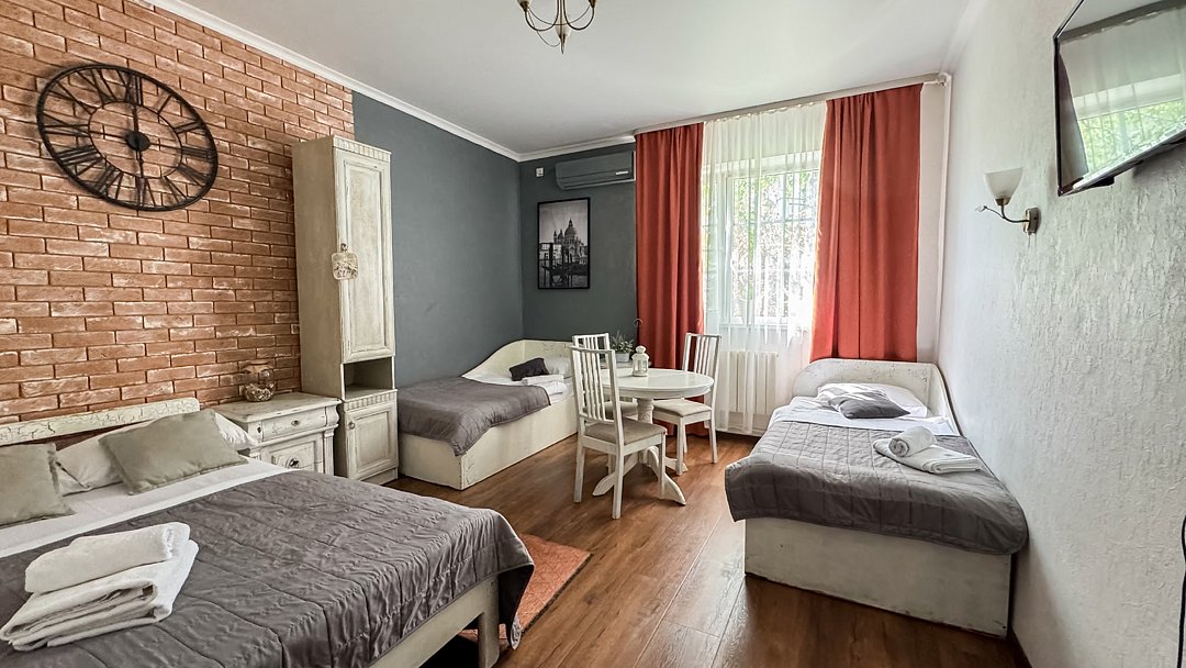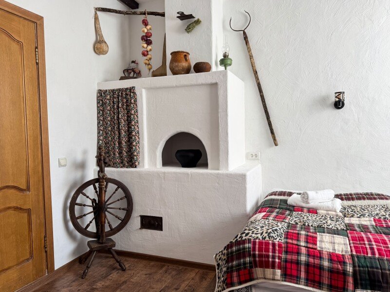 Уютный номер в деревенском стиле с сундуком и лавкой. Стена обшита натуральным деревом. С видом на старые домики Ростова. Тихо и уютно.