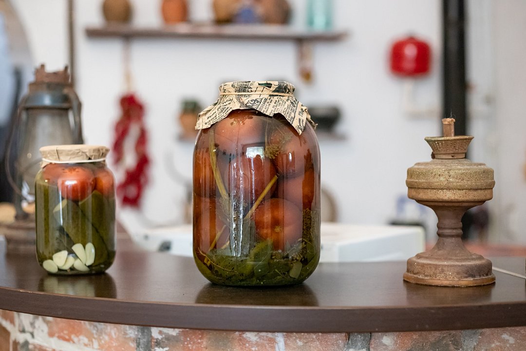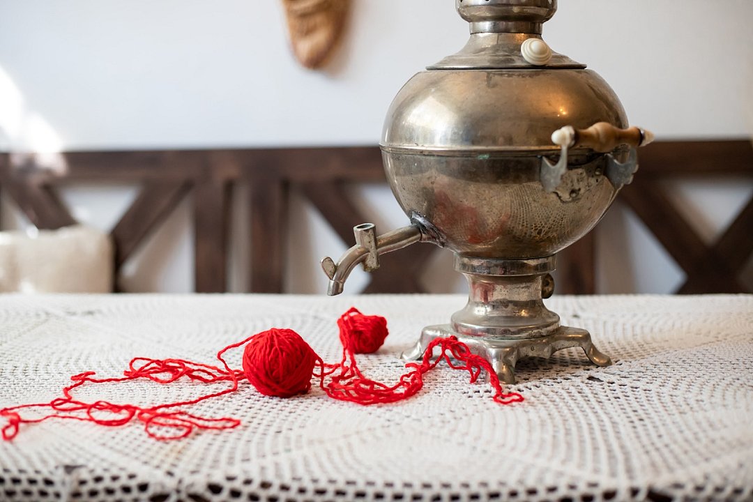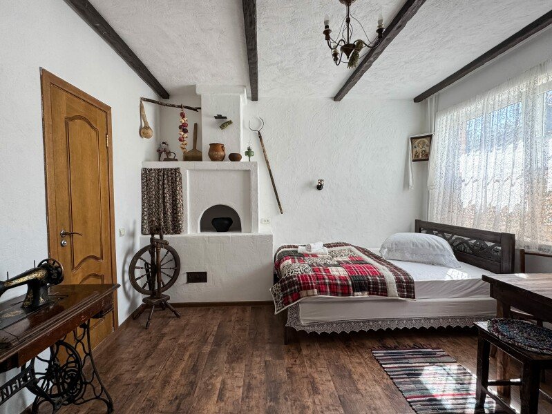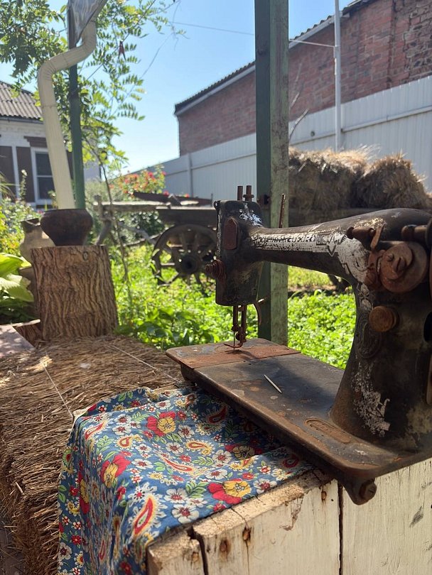 Номер выполнен в казачем стиле. Сундук, которому больше 100 лет, сохранил старые наклейки. Прялка. Швейная машина, стилизованная под стол. Казачье зеркало. На подушках накидки, как в настоящей казачьей избе. Половички и старинные вышивки.