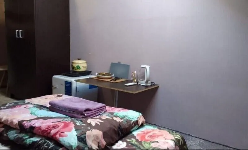 Своя дверь на ключ, спальное место 2000*1600, розетка. На этаже есть холодильник, гладильная, мультиварка, раковина.