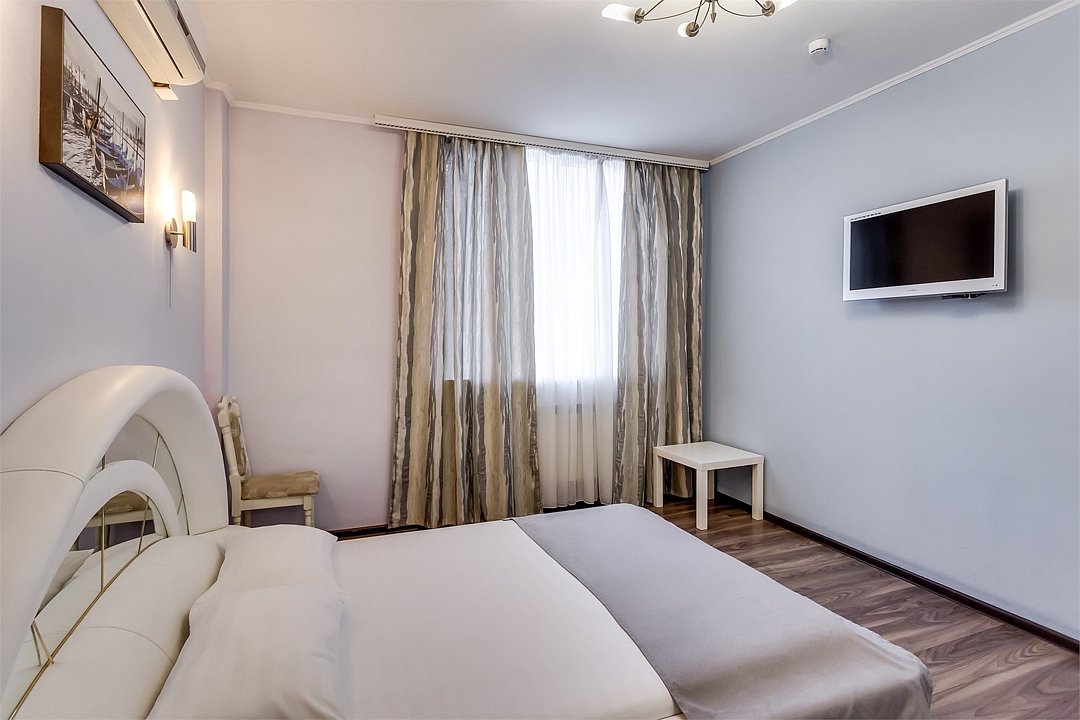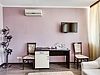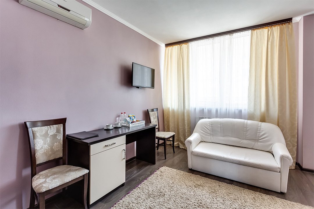 телевизор, Wi-Fi, холодильник, кондиционер, микроволновая печь, ванна, халаты, банные полотенца, тапочки, гигиенические средства, двуспальная кровать, диван, тумбы, стулья, шкаф для одежды, письменный стол, зеркало, набор посуды, чайник, раковина, вид на город, вид во дворВ гостиничном номере