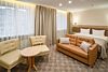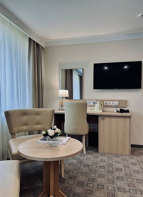 телевизор, Wi-Fi, фен, электронные замки, душевая кабина, халаты, банные полотенца, тапочки, гигиенические средства, двуспальная кровать, кресла, тумбы, шкаф для одежды, вешалки, журнальный столик, письменный стол, багажная тумба, зеркало, пуфики, письменные принадлежности, информационная карта, меню, сейф, унитаз, раковина, питьевая вода, гостиная зона, ковровое покрытие, отопление, кулер на этаже, вид во двор, стаканы, стул, сплит-система, вид на парк, раскладной диван, гостиничная парфюмерия, номер для некурящих, онлайн-регистрация до заезда, фригобар, чайная станция, уборка номераВ гостиничном номере