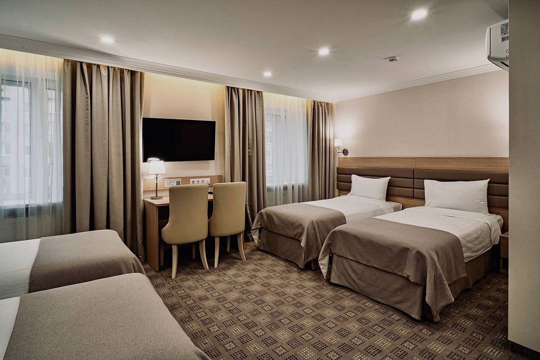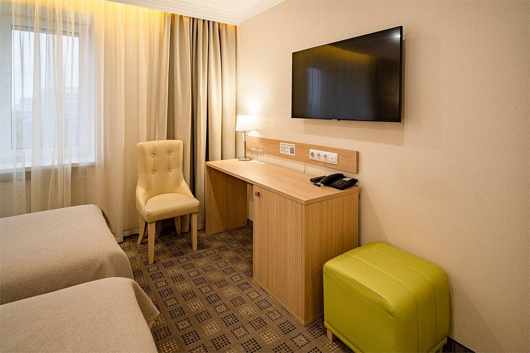 телевизор, Wi-Fi, телефон, кондиционер, фен, электронные замки, санузел, банные полотенца, двуспальная кровать, две односпальные кровати, тумбы, стулья, письменный стол, зеркало, сейф, раковина, косметическое зеркало, ковровое покрытие, отопление, душ, вид на город, кулер на этаже, вид во двор, стаканы, номер для некурящих, онлайн-регистрация до заезда, фригобар, мылоВ гостиничном номере