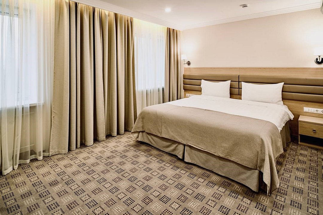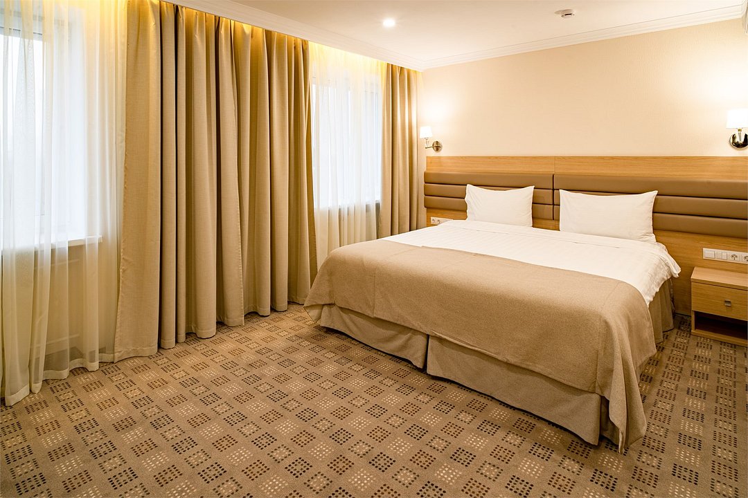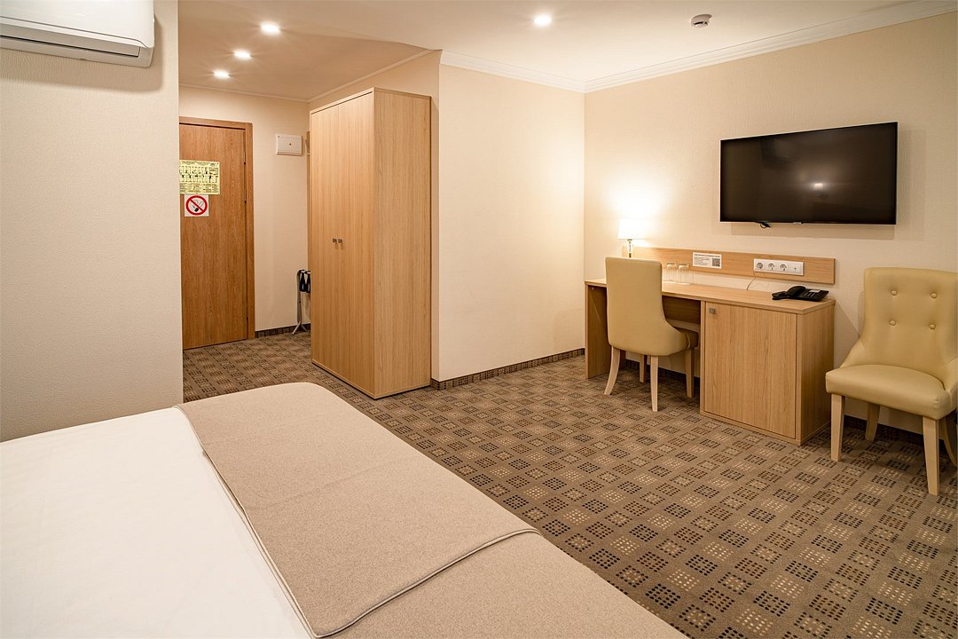 Номер состоит из комнаты, прихожей и ванной. Общая площадь номера 24 кв.м. Оснащение номера: одна двуспальная кровать, набор мебели (стол, стул, тумба, шкаф), сплит-система, мини-холодильник, телевизор. Есть возможность поставить евро раскладушку за дополнительную плату (запрашивать при бронировании, количество мест ограничено) Прописать в примечании при бронировании. В стоимость номера включен WI-FI.Услуги и удобства