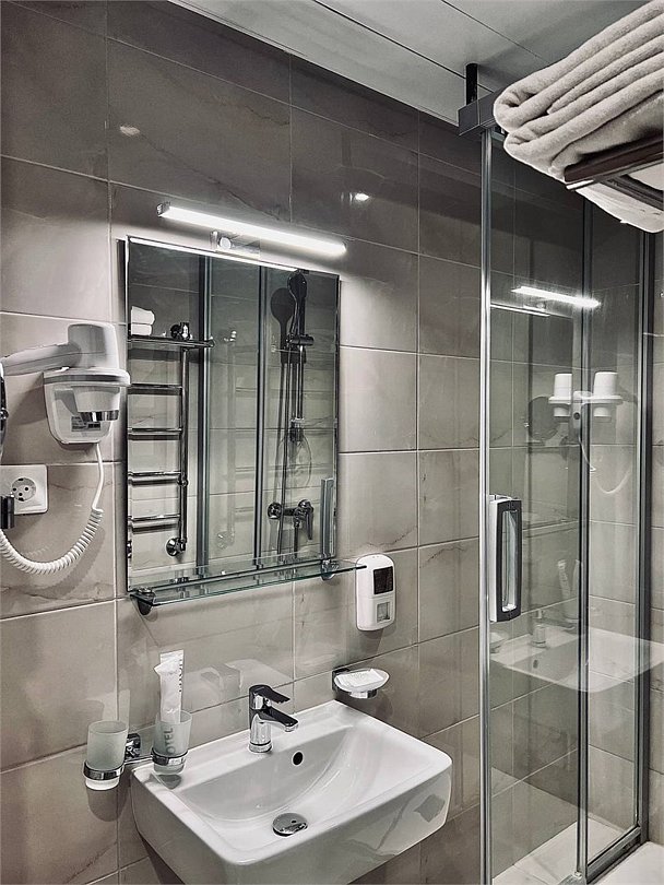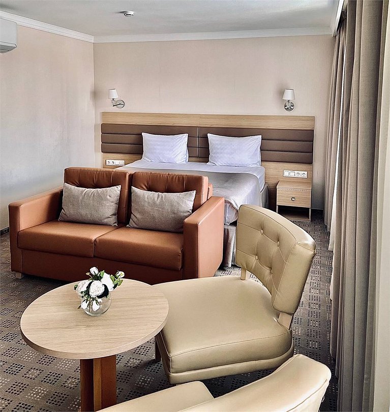 Номер состоит из комнаты, прихожей и ванной комнаты. Общая площадь номера 35 кв.м. Размещение до 3 человек. Ребенку до 5 лет бесплатное проживание без дополнительного места (ребенок спит с родителями, постельное не предусмотрено). Детям от 0 до 3 лет предоставляется бесплатно кроватка, по запросу.(количество ограничено). Оснащение номера: одна двуспальная кровать, диван, набор мебели (стол, стул, тумба, шкаф), сплит-система, мини-холодильник, телевизор. В стоимость номера включен доступ WI-FI; электрический чайник, тапочки, халаты, гигиенические наборы, гель для душа в дозаторе.Услуги и удобства