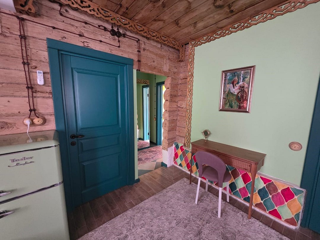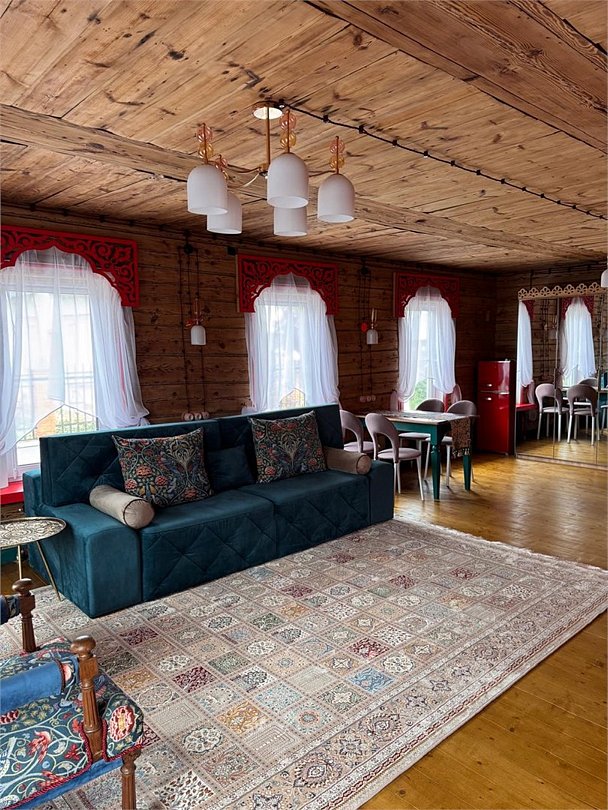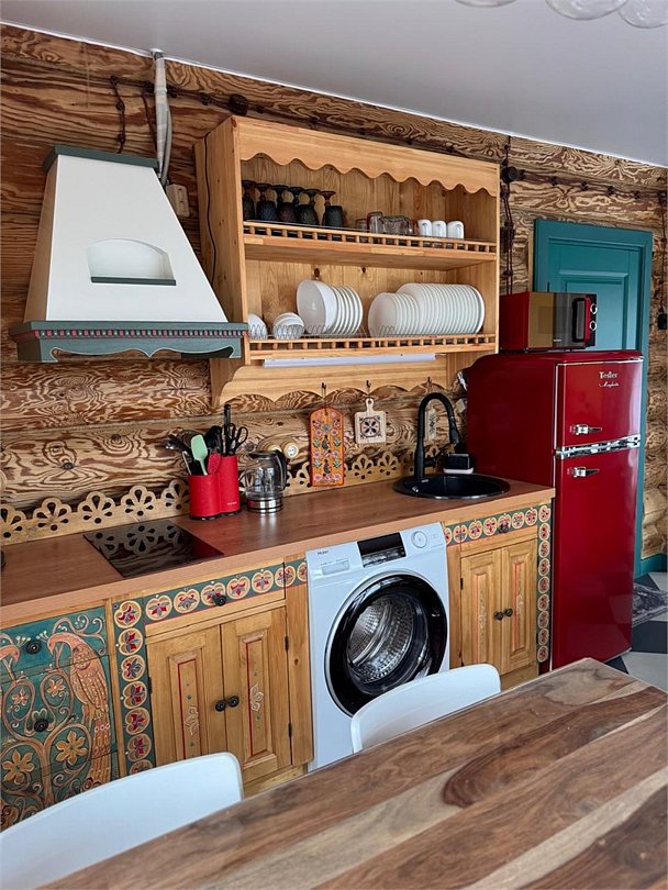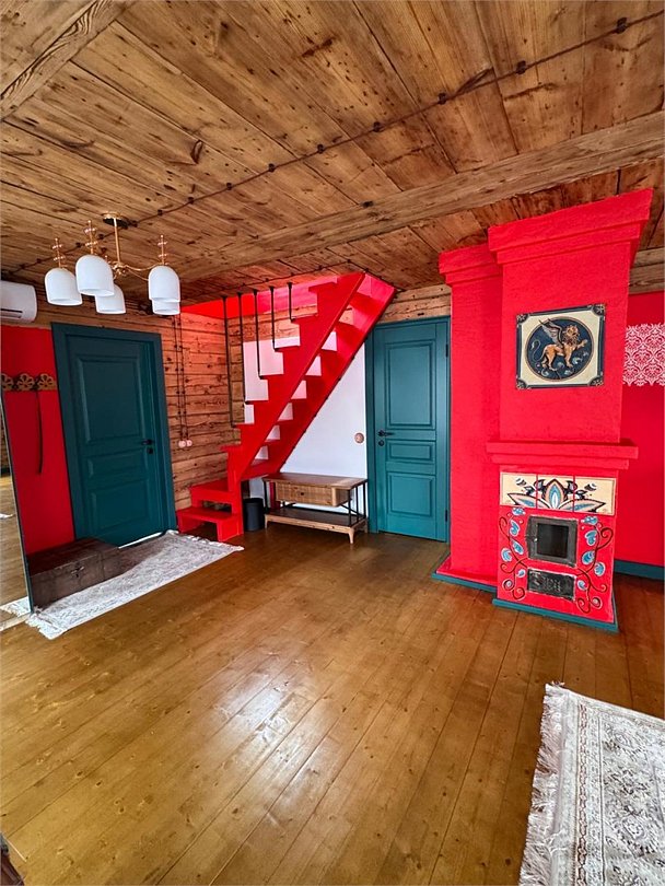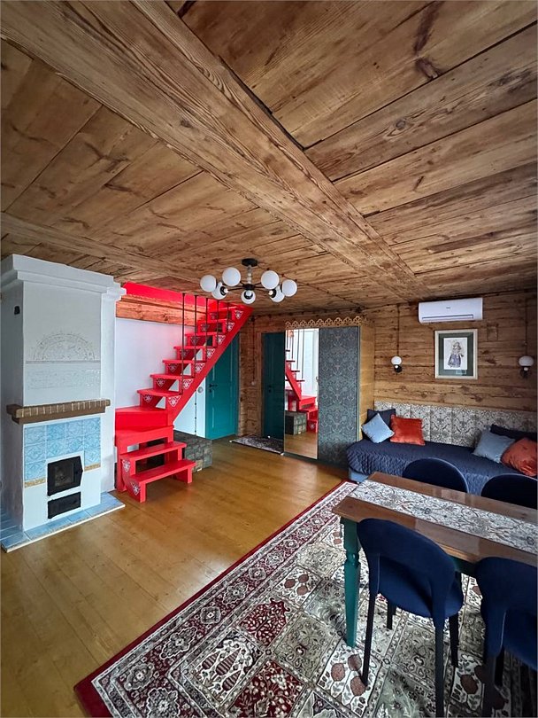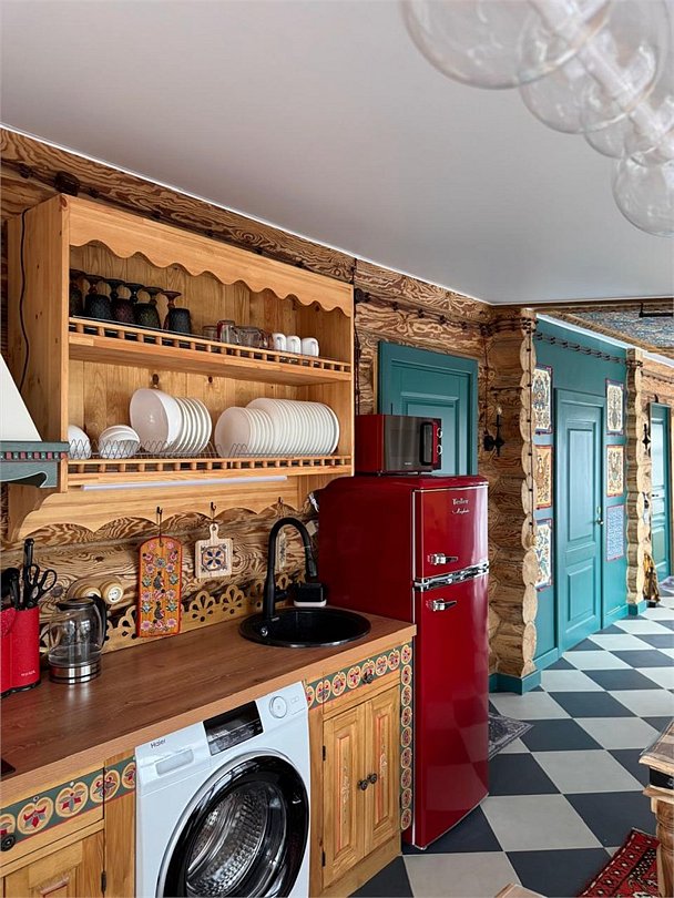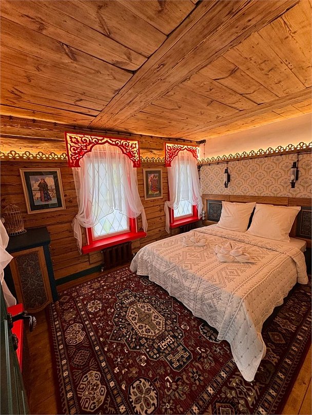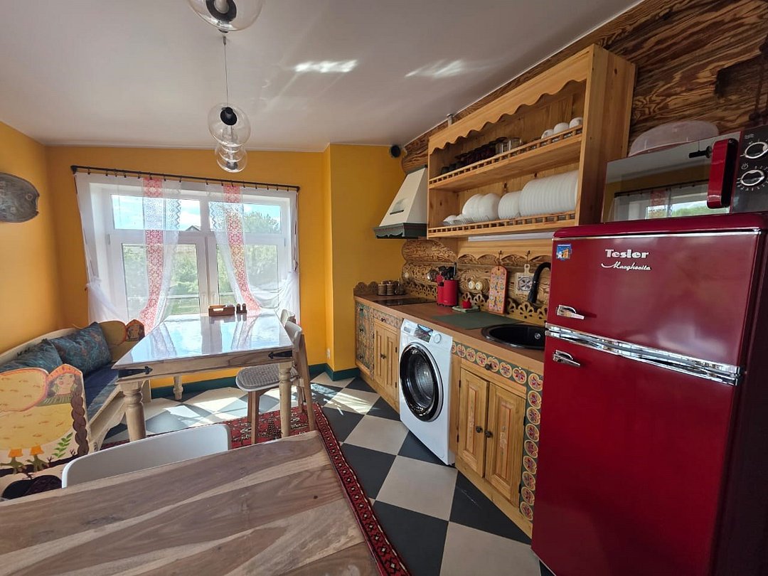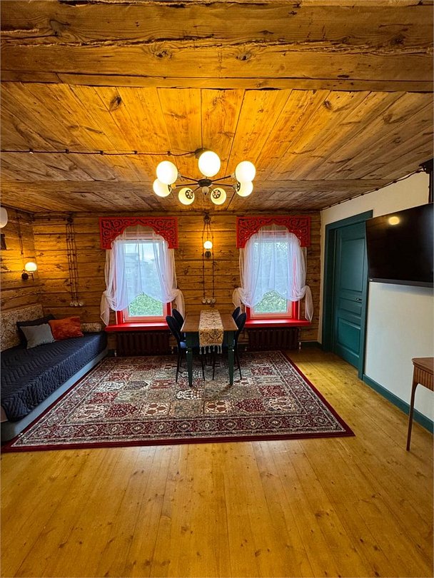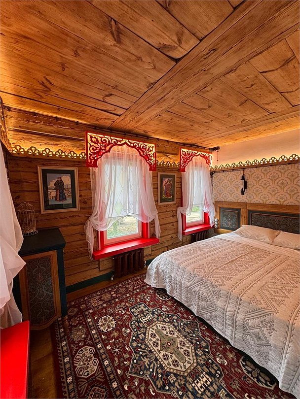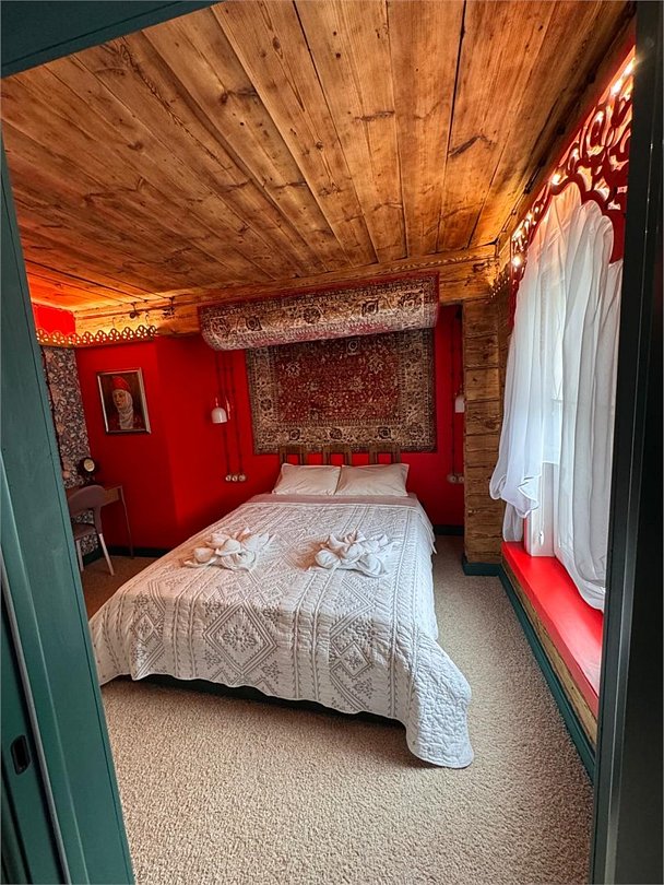 Номер находится на 2-м этаже. На этаже расположена общая кухня с обеденной зоной. На кухне имеется все для приготовления еды: посуда, столовые приборы, микроволновка, электрический чайник. Стиральная машина расположена также на этаже. Номер-драгоценность в доме XIX века. Красные стены, ковры и рубиновые акценты создают атмосферу богатой горницы. Тёплый светильник, этнический декор и уютный текстиль делают пространство идеальным для романтических поездок, фотосессий и семейного отдыха. Печь растапливать запрещено.Услуги и удобства
