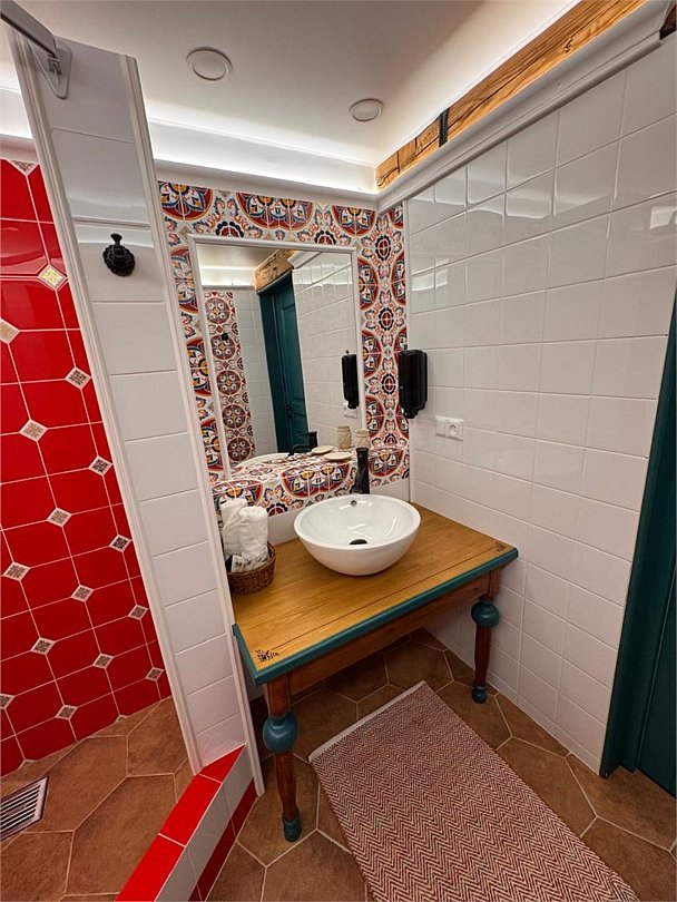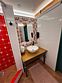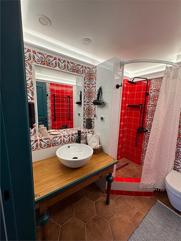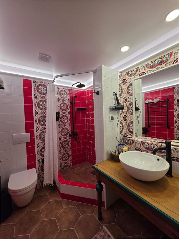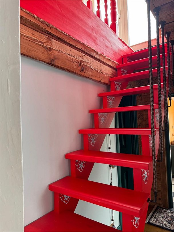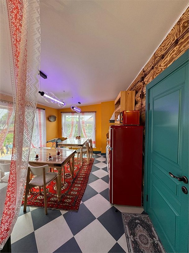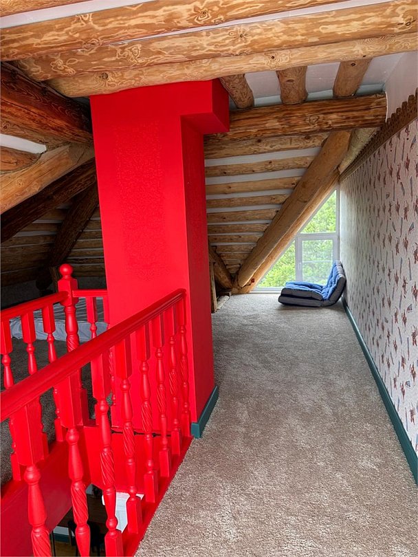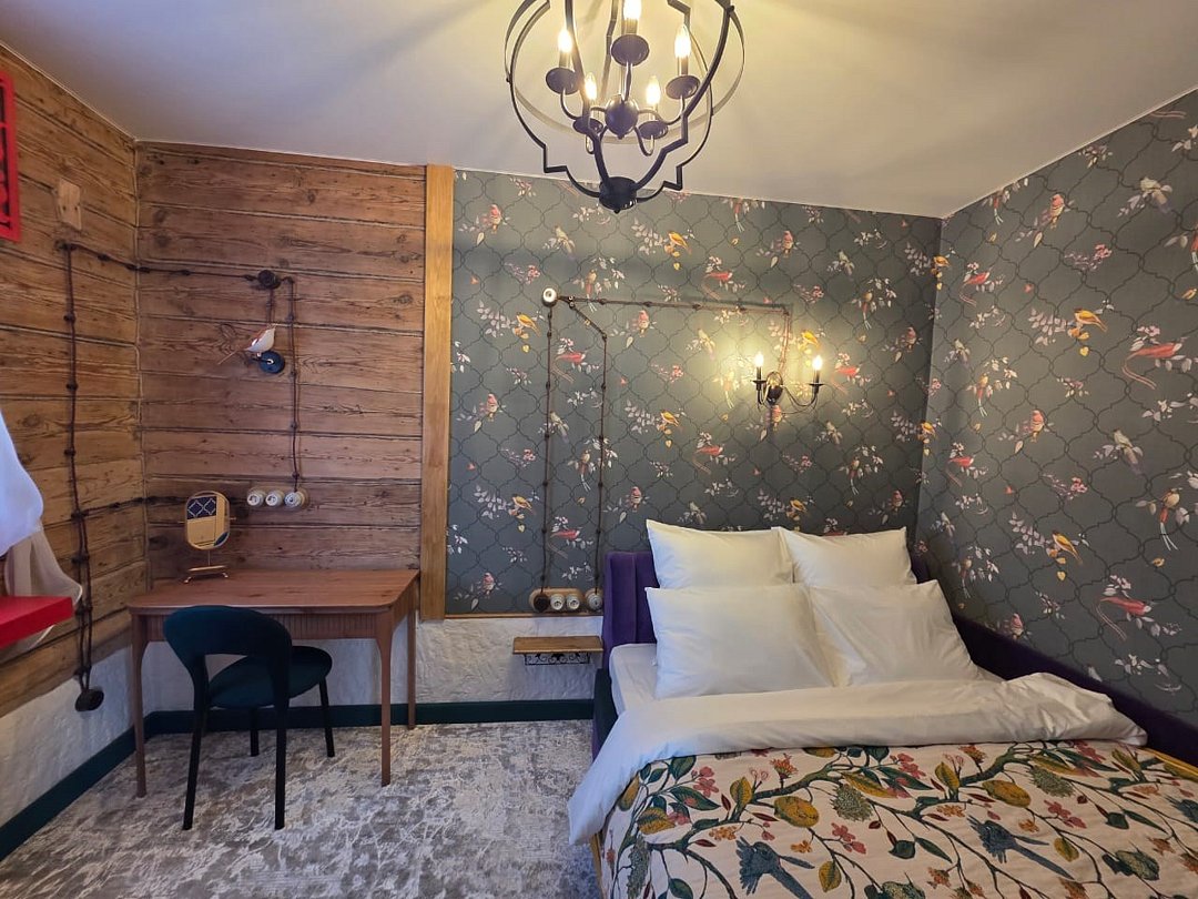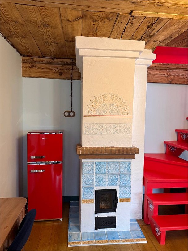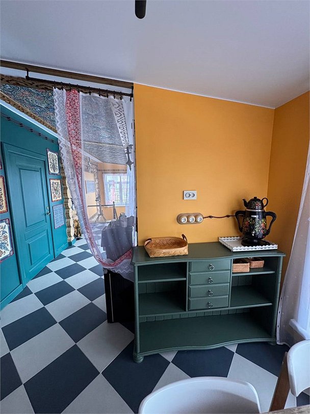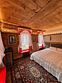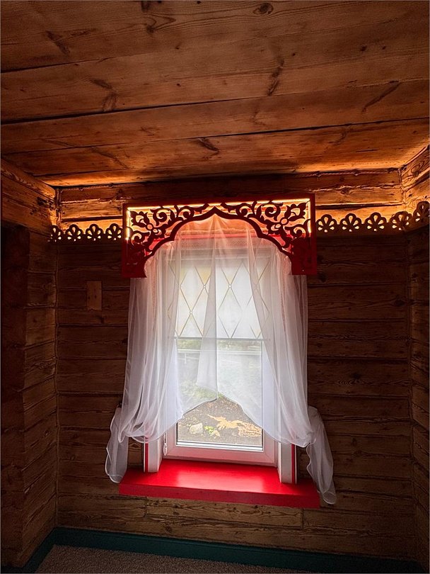 Номер находится на 2-м этаже. На этаже расположена общая кухня с обеденной зоной. На кухне имеется все для приготовления еды: посуда, столовые приборы, микроволновка, электрический чайник. Стиральная машина расположена также на этаже. Номер-драгоценность в доме XIX века. Красные стены, ковры и рубиновые акценты создают атмосферу богатой горницы. Тёплый светильник, этнический декор и уютный текстиль делают пространство идеальным для романтических поездок, фотосессий и семейного отдыха. Печь растапливать запрещено.Услуги и удобства