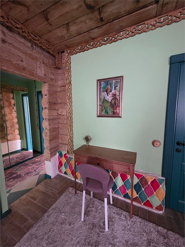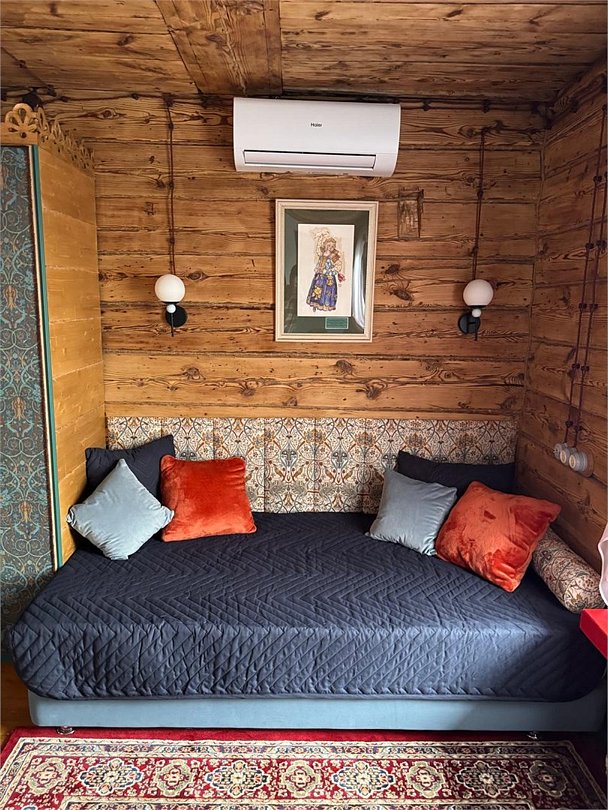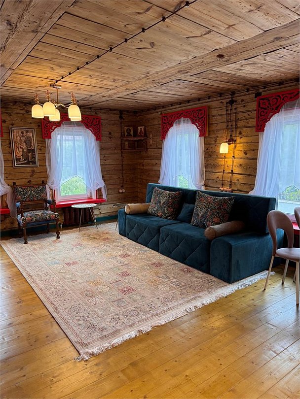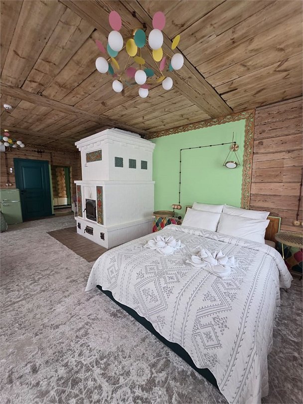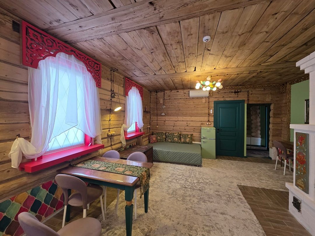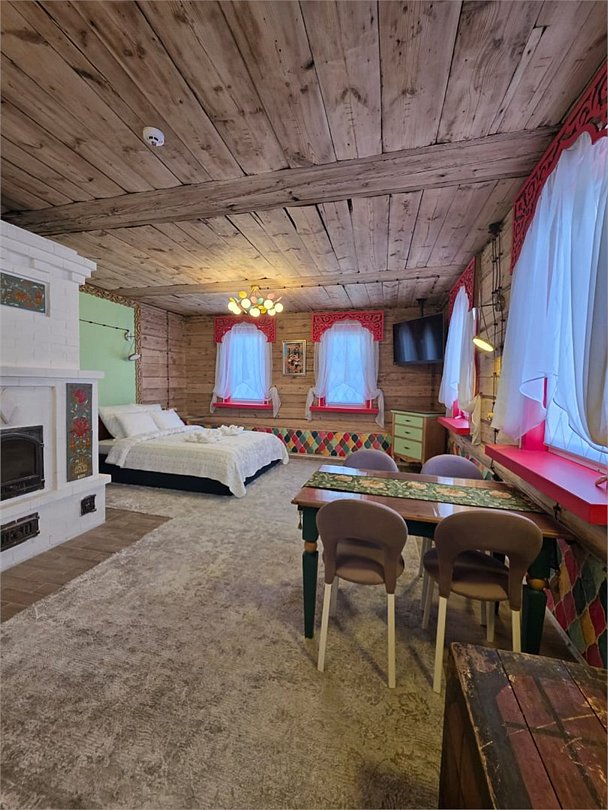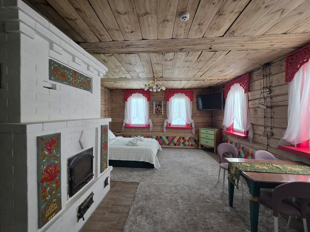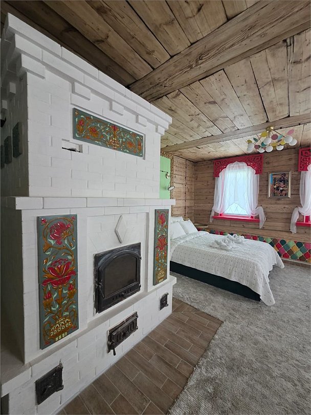 Большой светлый номер в историческом доме из бруса. Белая печь с росписями, резные наличники и тёплый текстиль создают ощущение русской светёлки. Есть стол‑мастерская и мягкий свет — идеально для спокойных выходных, чтения и камерных фотосессий. Номер расположен на 1-м этаже. На этаже имеется общая кухня со столовыми приборами, посудой, микроволновой печью, холодильником и стиральной машиной. Печь растапливать запрещено.Услуги и удобства