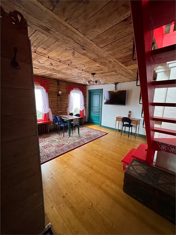 Апартаменты с мансардой, видом на Ростовский кремль и озеро Неро. Номер находится на 2-м этаже. На этаже расположена общая кухня с обеденной зоной. На кухне имеется все для приготовления еды: посуда, столовые приборы, микроволновка, электрический чайник. Стиральная машина расположена также на этаже. Двухуровневый номер в доме XIX века. Просторная гостиная с голубой печью и яркой лестницей ведёт в приватную мансарду. Там гостей встречают панорамное окно и обои с птицами. Идеально для семей, пар и тех, кто ищет вдохновение и уют. Печь растапливать запрещено.Услуги и удобства