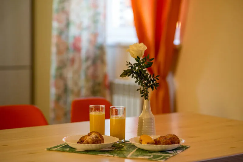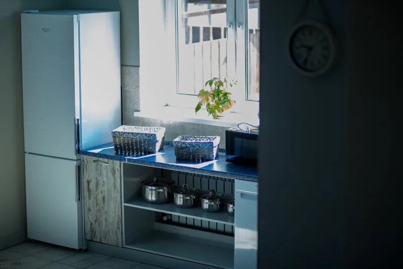 Для возможности самостоятельной готовки кухонная зона оборудована современной бытовой техникой. Имеется холодильник, варочная поверхность, микроволновая печь, чайник и обеденный стол.