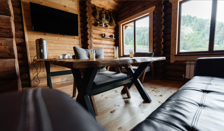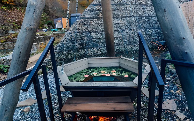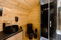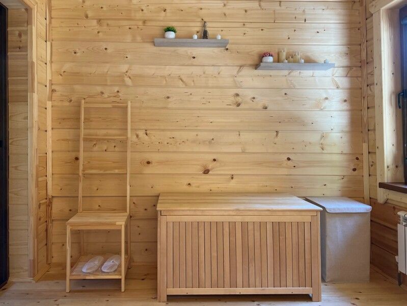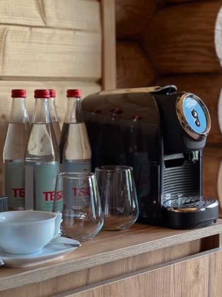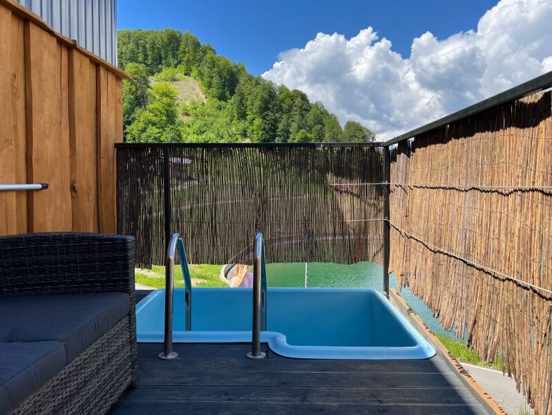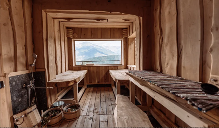 - На первом этаже коттеджа располагается парная с панорамным видом на горы и купели (горячая и холодная) с ключевой водой на террасе.