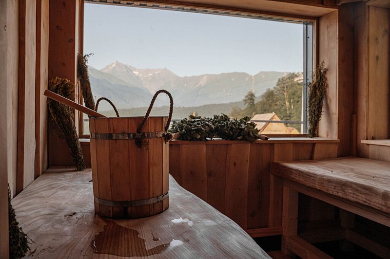 На первом этаже коттеджа располагается парная с панорамным видом на горы и купели (горячая и холодная) с ключевой водой на террасе.