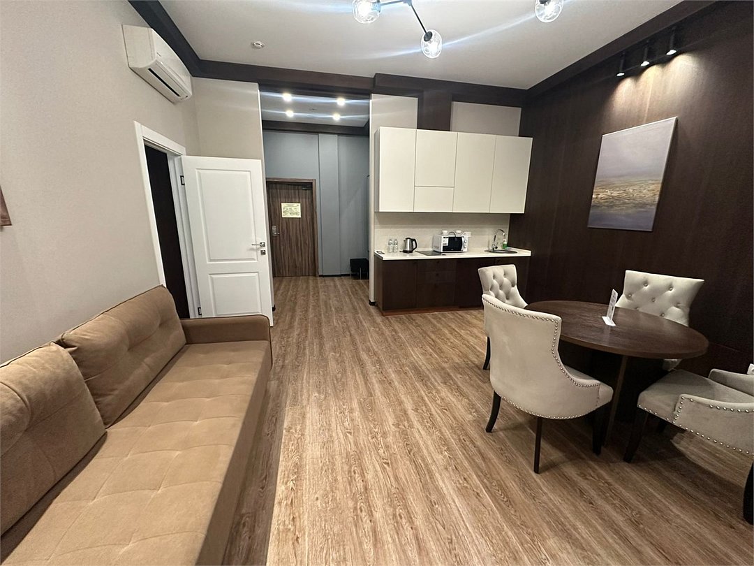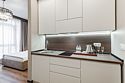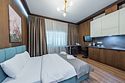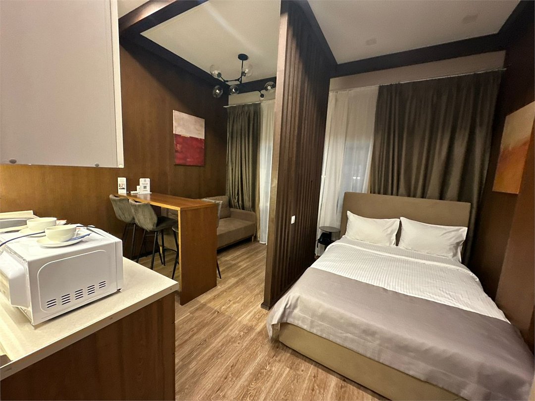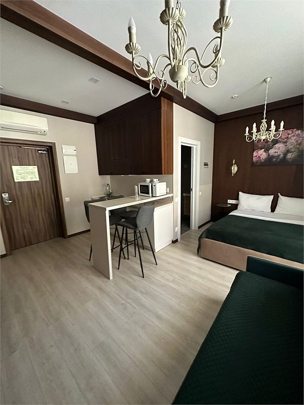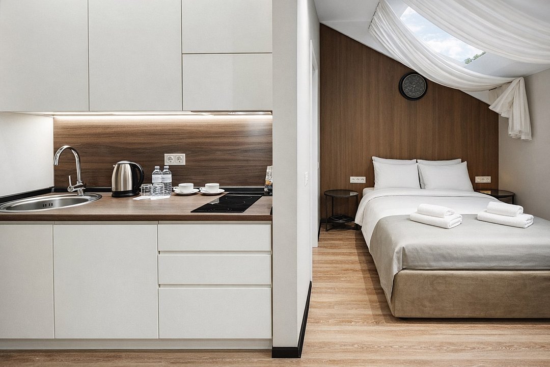Студия Классик (26 м²) — комфортный номер для 2-3 гостей с двуспальной кроватью (140×200) и раскладным диваном. Уютное пространство с продуманным дизайном создаёт атмосферу домашнего тепла. По запросу доступна детская кроватка. Интерьер, вид из окна и планировка могут отличаться.Услуги и удобства