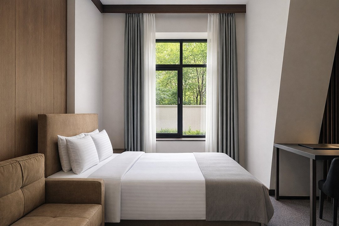 Стандарт Классик (21 м²) — уютный номер с двуспальной кроватью (140×200), идеальный для отдыха 1–2 гостей. Пространство оформлено в теплом стиле, создающем атмосферу домашнего комфорта после активного дня. По запросу доступна детская кроватка. Дизайн, планировка и вид из окна могут отличаться.Услуги и удобства