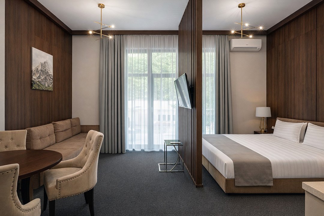 Wi-Fi, холодильник, фен, электронные замки, плита для приготовления пищи, микроволновая печь, утюг, халаты, банные полотенца, тапочки, гигиенические средства, косметические средства, двуспальная кровать, диван, стулья, шкаф для одежды, вешалки, обеденный стол, две комнаты, кухня, чайный набор, набор посуды, сейф, чайник, раковина, питьевая вода, обеденная зона, гостиная зона, отопление, душ, вид на город, вид во двор, кухонная посуда, стаканы, кухонная утварь, столовые приборы, туалетные средства, туалет, вид на горы, телевизор со Smart TV, вид на лесВ гостиничном номере