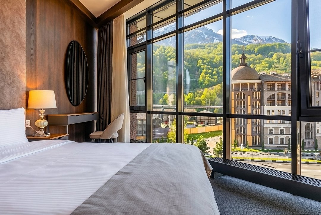 Просторной террасой с панорамными видами на горы! Апартаменты с террасой (86 м² + терраса 17 м²) — роскошный трёхкомнатный номер для 2-6 гостей с двумя спальнями (кровати 160×200), гостиной с раскладным диваном и террасой. Идеальный вариант для семейного отдыха с возможностью размещения детской кроватки по запросу. Просторные апартаменты с элегантным дизайном создают атмосферу уюта и комфорта класса люкс.Услуги и удобства