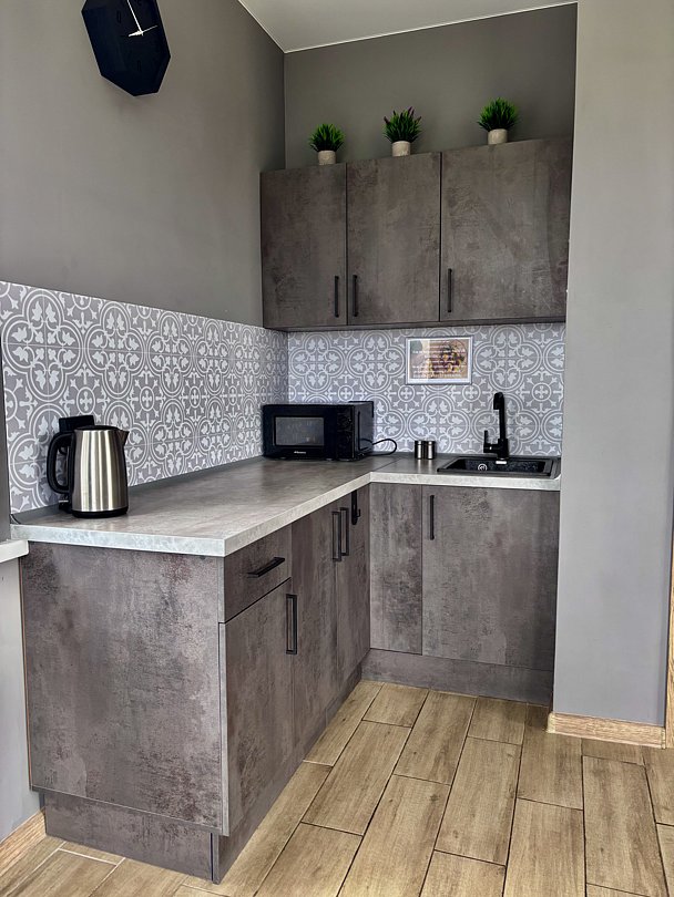 - кухонная зона с холодильником, электрической варочной панелью, микроволновой печью, чайником и всем необходимым для приготовления пищи;