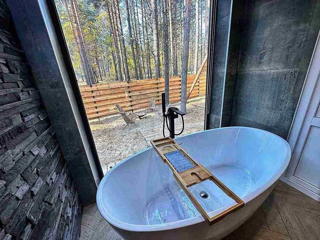 Преимущества дома: удаленное заселение, Wi-Fi, ванна с панорамным видом, кондиционер, телевизор со Smart TV, полностью оборудованная кухня (микроволновая печь, электрический чайник, холодильник), посуда для готовки (салатники, ножи, разделочные доски), набор посуды на четыре человека (глубокие тарелки, плоские тарелки, кружки для чая, бокалы под сок, рюмки, фужеры, ложки, вилки и ножи).