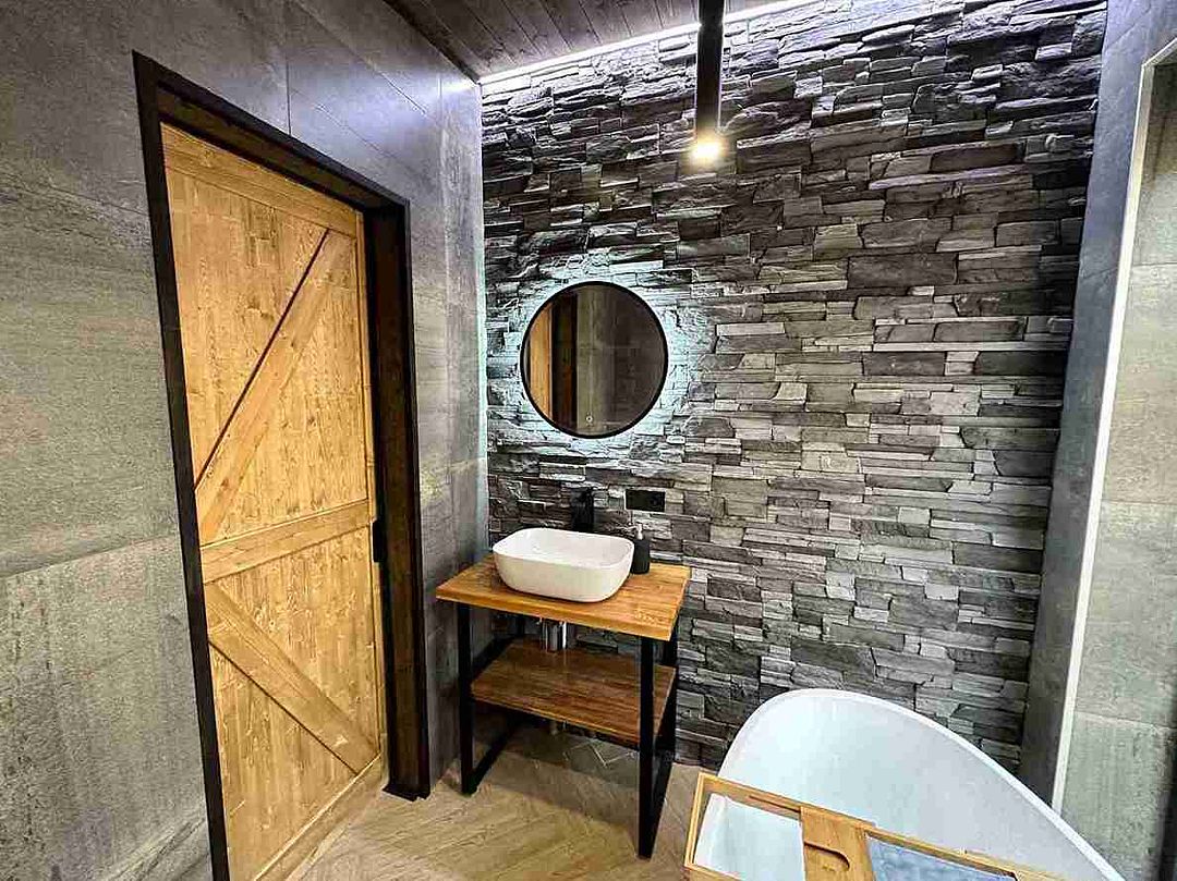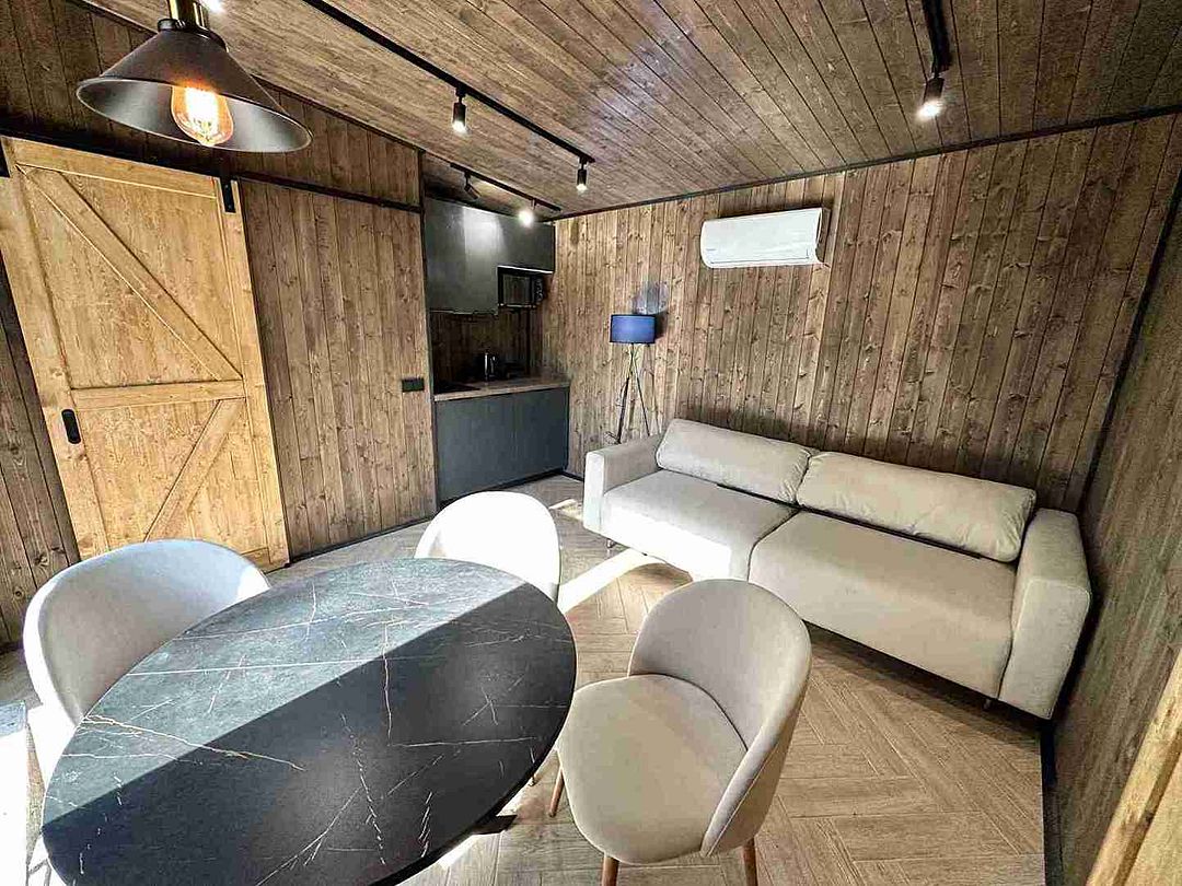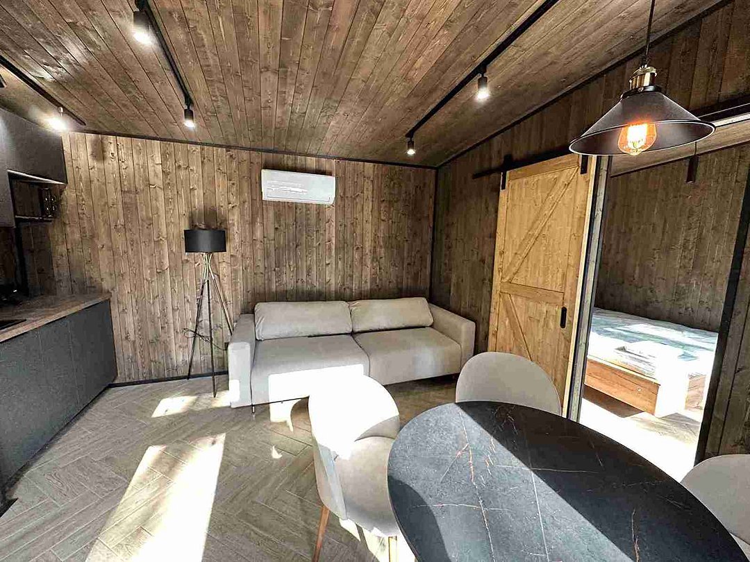 Внутреннее пространство виллы продумано до мелочей. На первом этаже расположены спальня, полностью оборудованная кухня и светлая гостиная с обеденным столом, где можно собраться с близкими за вкусным ужином. С виниловым проигрывателем и встроенной колонкой вы сможете наслаждаться любимыми мелодиями, создавая идеальный фон для ваших вечеров. А удаленное заселение гарантирует полное уединение и приватность, позволяя вам сосредоточиться на отдыхе.