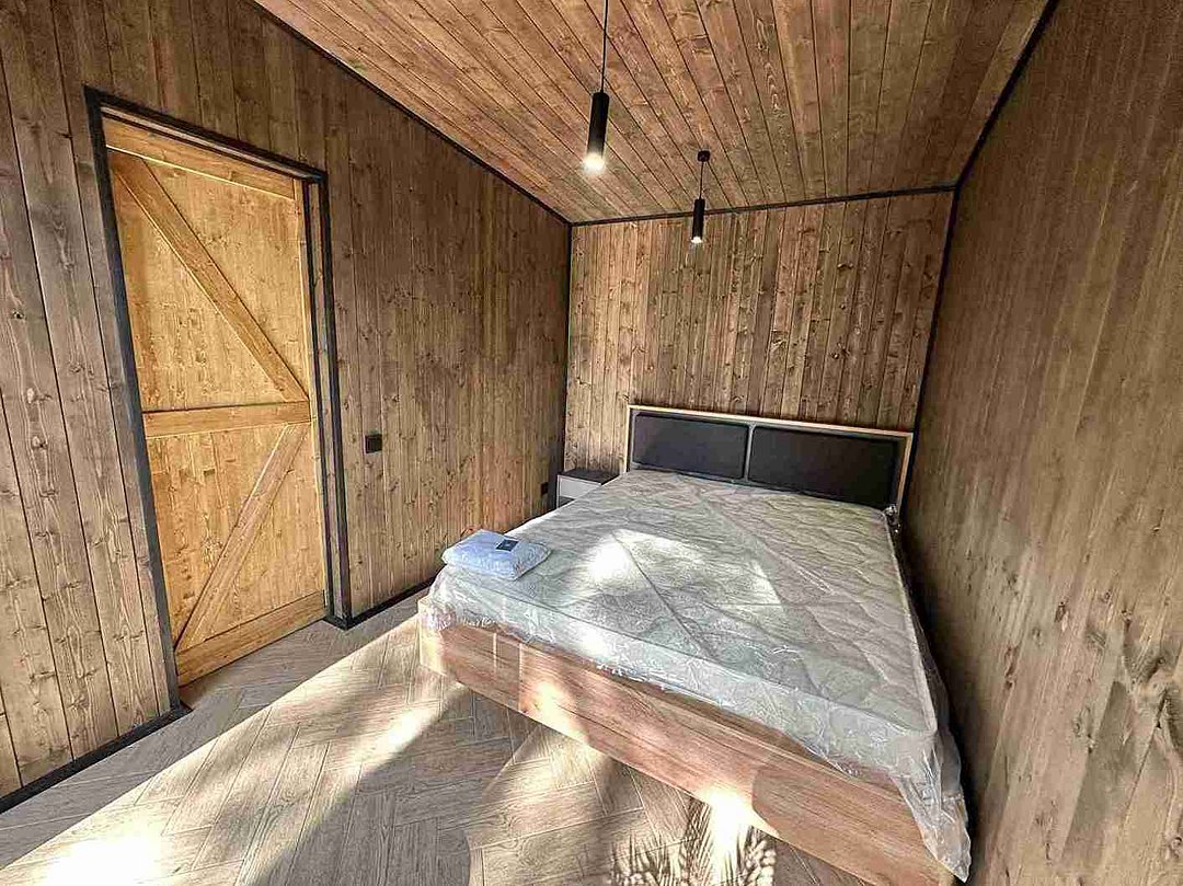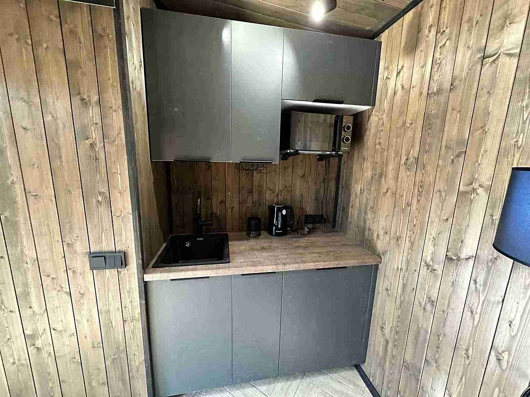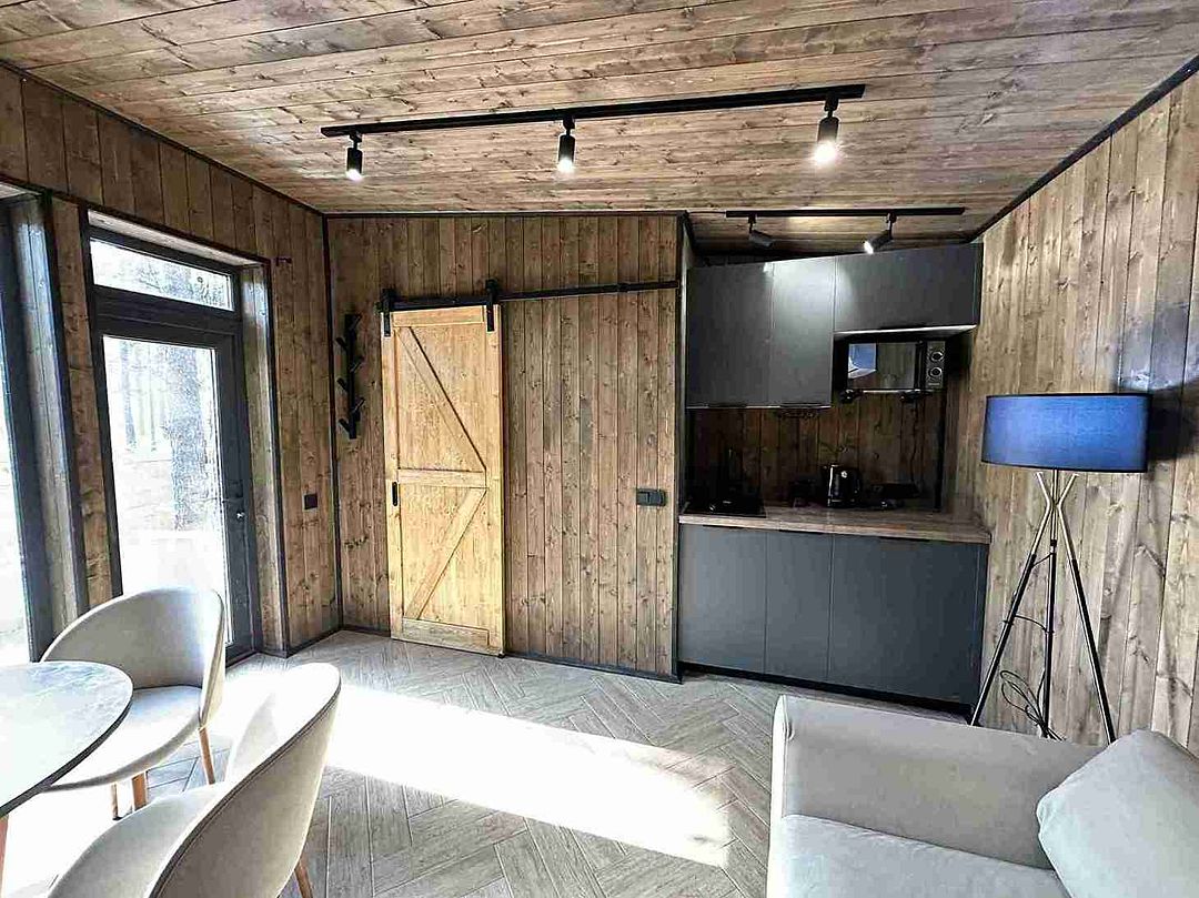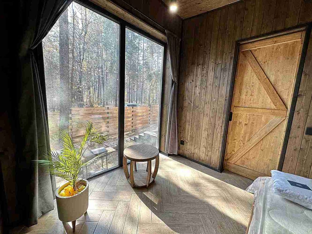 Уютный и абсолютно новый домик с потрясающим видом на сосновый лес. При желании можно задернуть шторы и погрузиться в атмосферу уединения и спокойствия. На первом этаже есть спальная комната, оборудованная кухня и гостиная с обеденным столом.