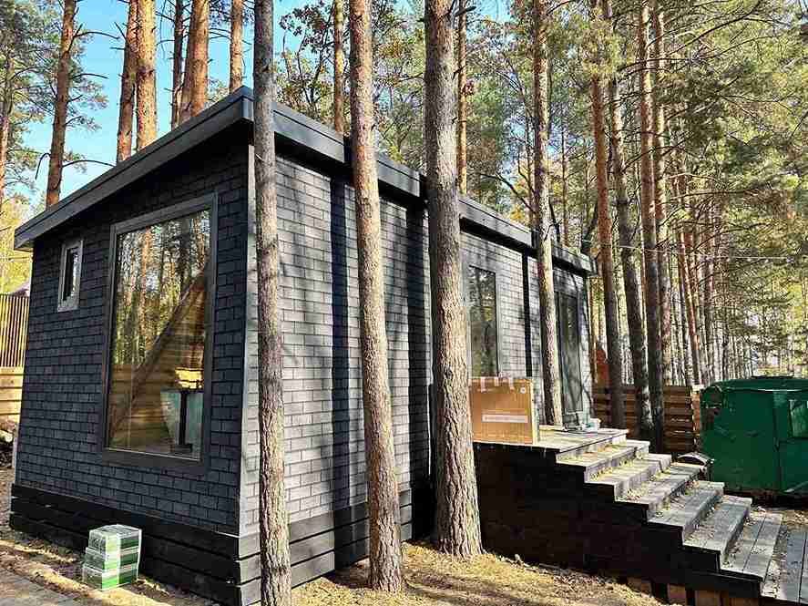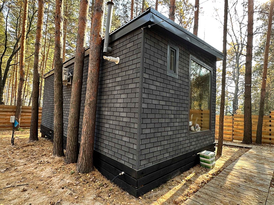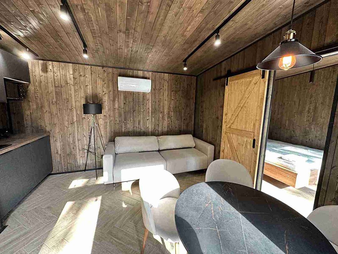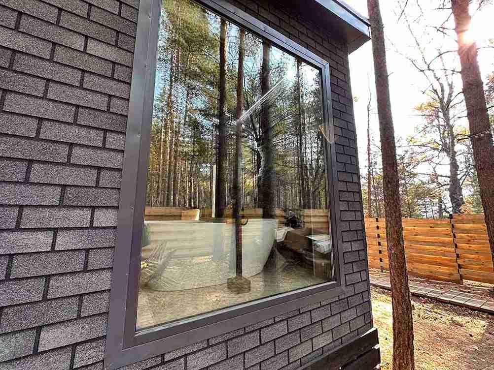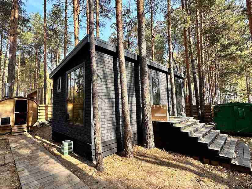 Уютный и абсолютно новый домик с потрясающим видом на сосновый лес. При желании можно задернуть шторы и погрузиться в атмосферу уединения и спокойствия. На первом этаже есть спальная комната, оборудованная кухня и гостиная с обеденным столом.