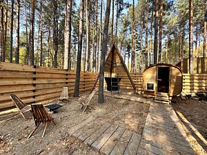 На территории, окруженной сосновым лесом, есть уютная зона для барбекю. Здесь гости смогут насладиться приготовлением восхитительных блюд на гриле-мангале.