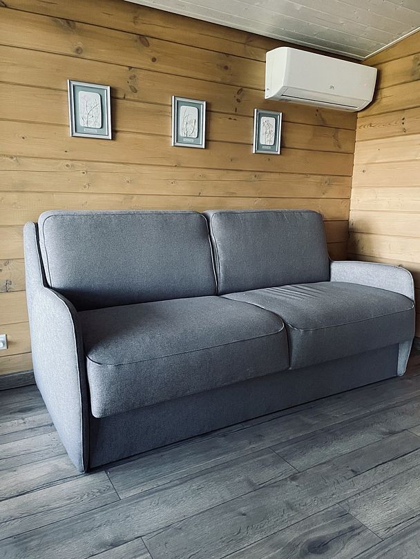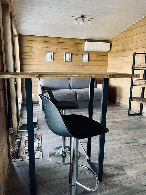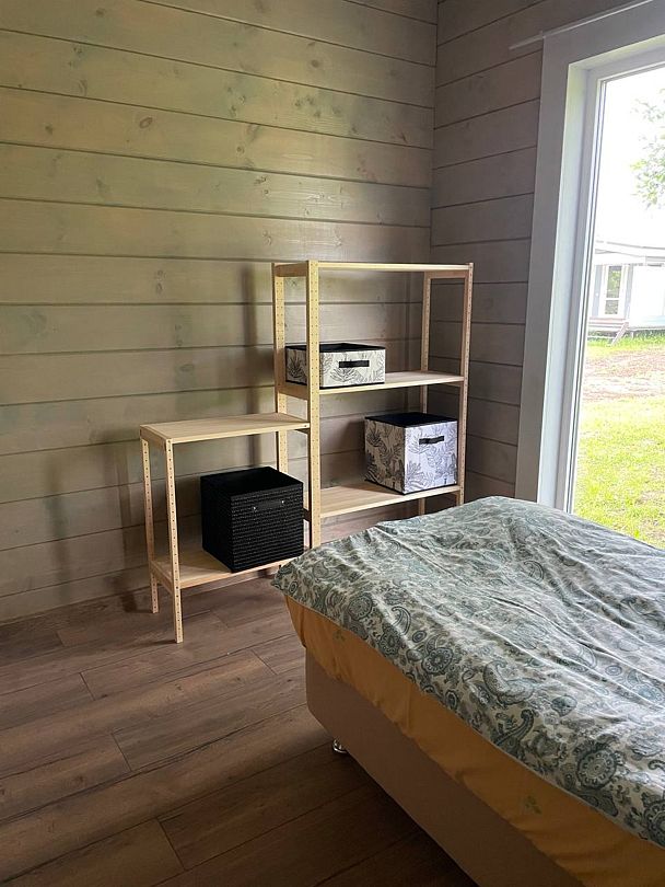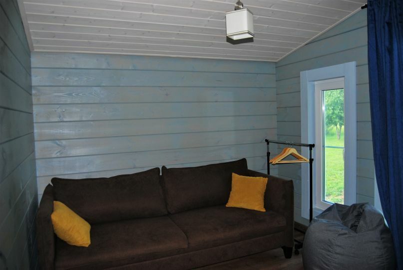 В первой спальне — двуспальная кровать (160х200 см) с ортопедическим матрасом. Во второй спальне — две односпальные кровати (80х200) с ортопедическим матрасом (при необходимости их можно сдвинуть). В третьей спальне — раскладной диван со спальным местом (140х200). Во всех спальнях есть место для хранения одежды. Удобная гостиная-кухня, оборудованная всем необходимым для отдыха и приготовления еды. В гостиной панорамное остекление, комфортный диван. У дома большая веранда с потрясающим видом.