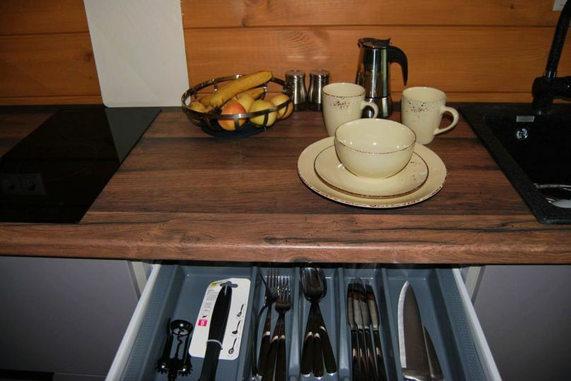 В спальне двуспальная кроватью (160х200 см) с ортопедическим матрасом. Удобная гостиная-кухня, оборудованная всем необходимым для отдыха и приготовления еды. В гостиной панорамное остекление, комфортабельный диван со спальным местом (160х200 см) и ортопедическим матрасом. У дома большая веранда с потрясающим видом.