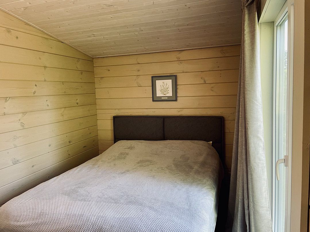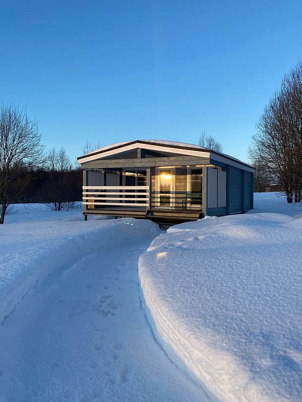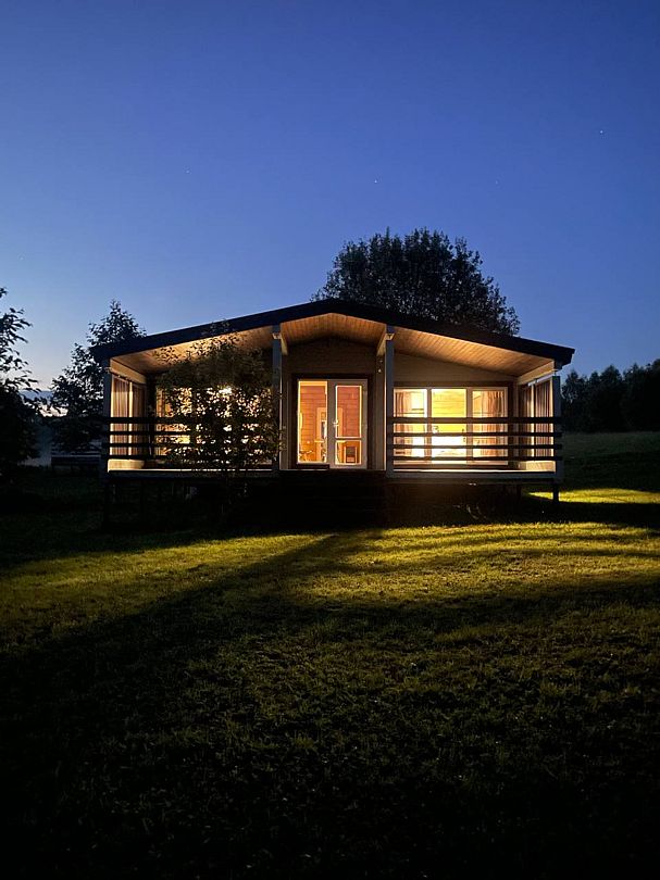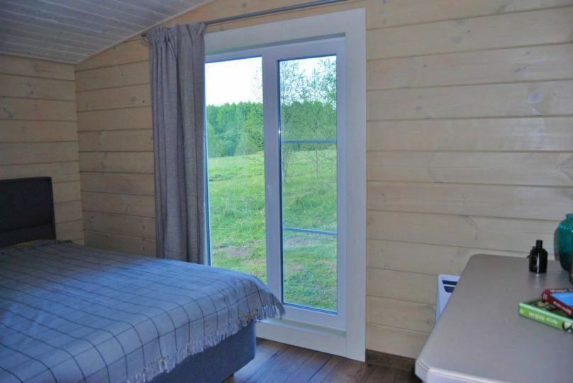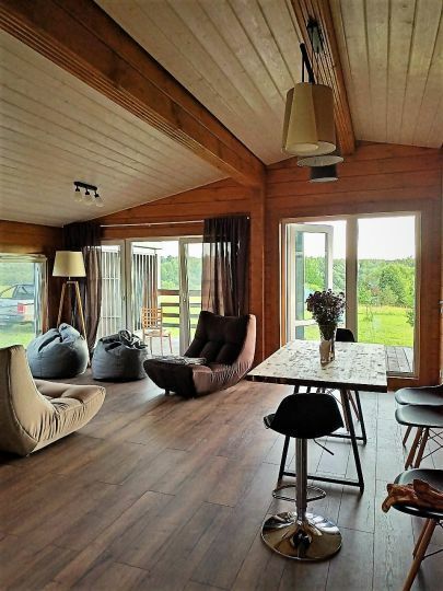 Уютный и комфортный дом из клеёного бруса с панорамным остеклением, откуда открывается очаровательный вид. Дом из двух комнат и санузла с душевой кабиной.