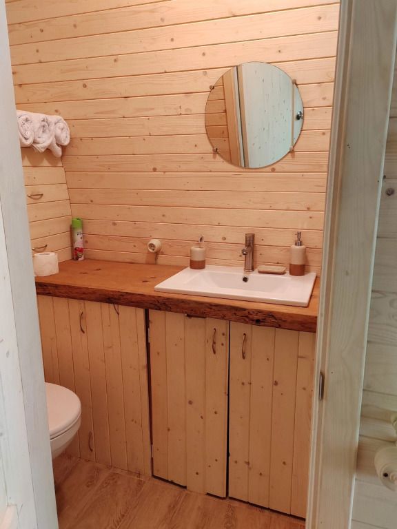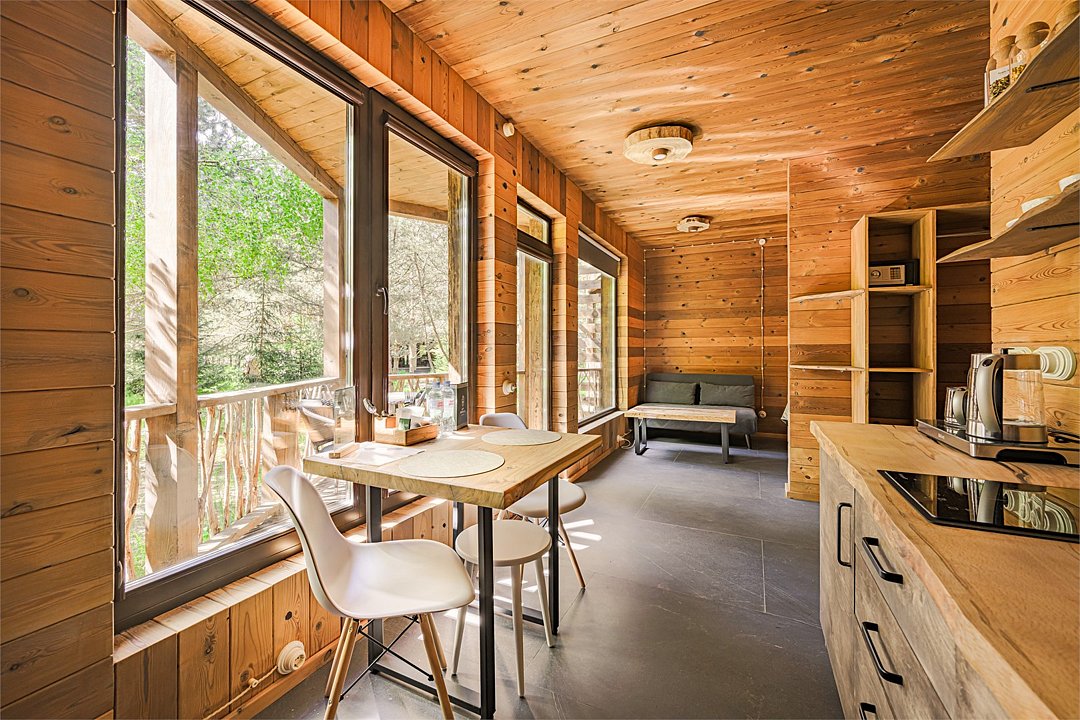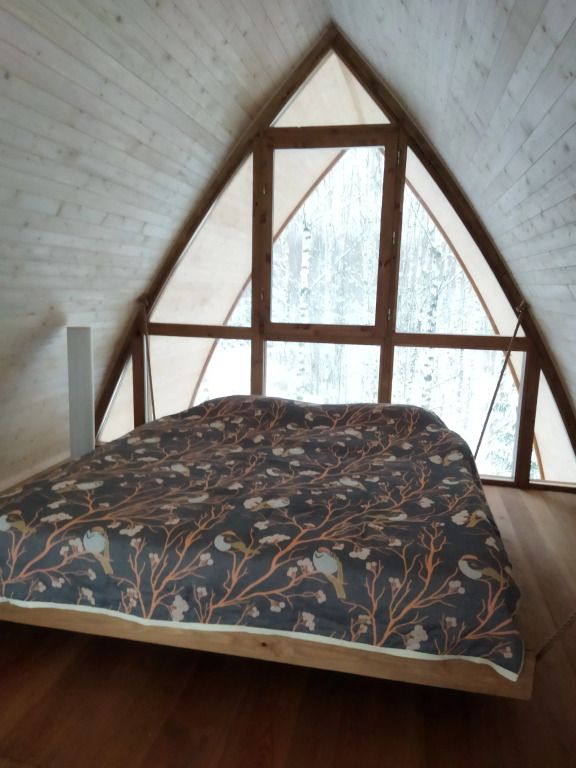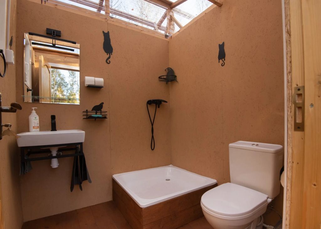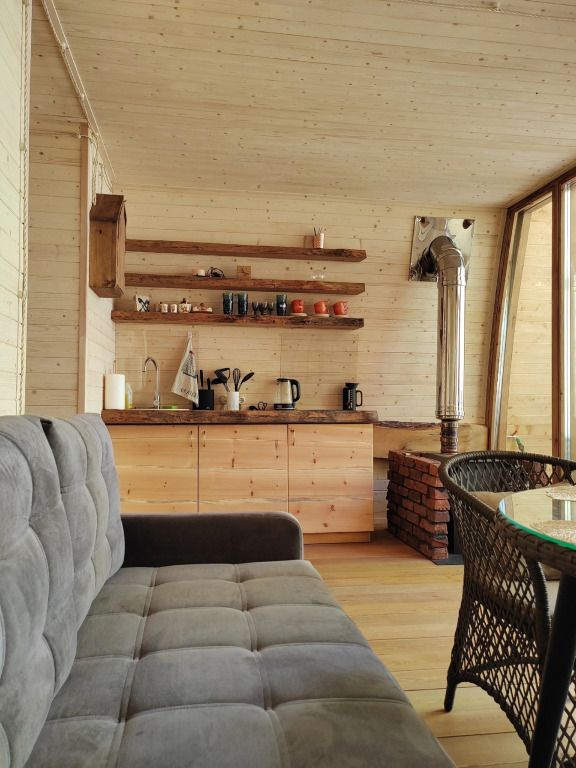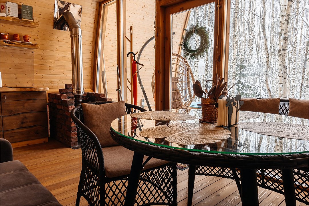 Wi-Fi, холодильник, плита для приготовления пищи, ванная комната, санузел, банные полотенца, терраса, две двуспальные кровати, кресла, вешалки, обеденный стол, стул, стол, вид на парк, панорамные окна, диван-кровать, раскладной диван, вид на лес, умная колонка, вешалки-плечики, мыло, окна от пола до потолкаВ эко-доме