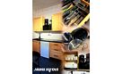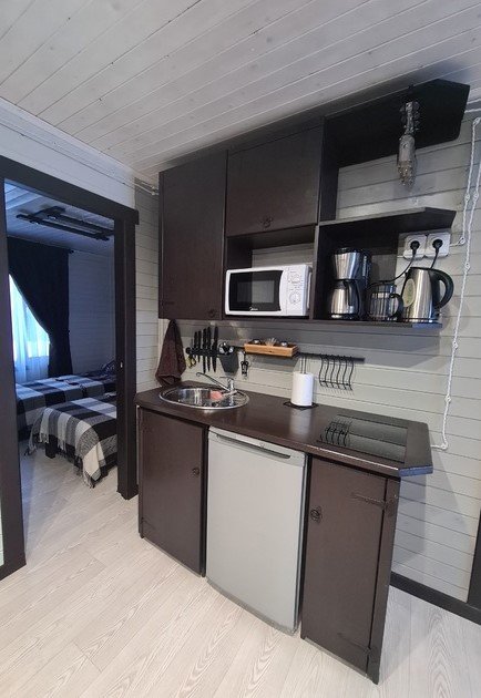 Дом с сауной оборудован мини-кухней, на ней есть все необходимое для комфортного проживания (чайник, кофеварка, холодильник, микроволновая печь, плита, комплект посуды на шесть персон, разные кухонные мелочи).