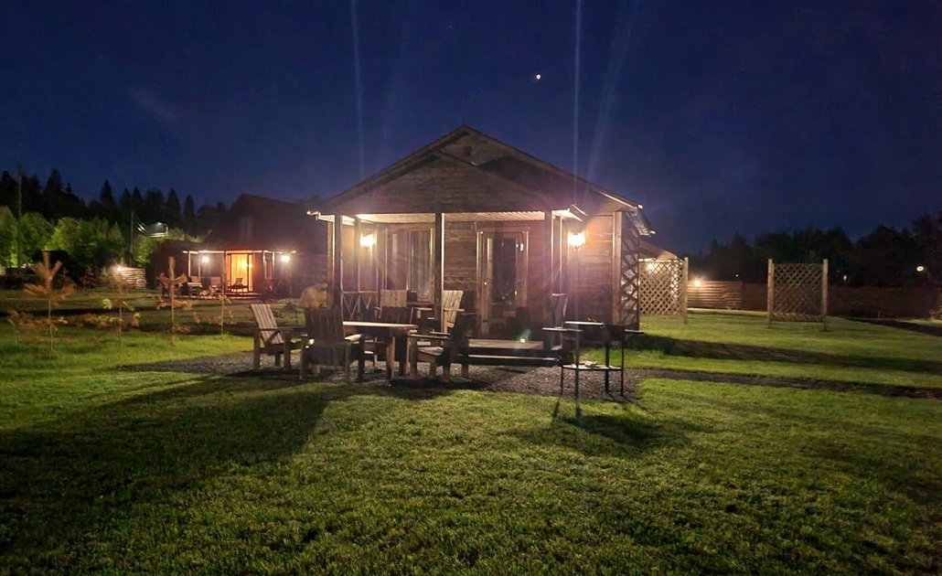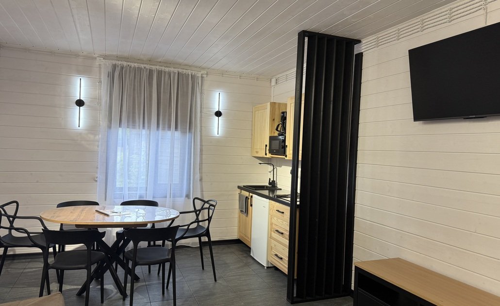 На территории комплекса находятся 2 комфортабельных домика. Для вашего удобства в домах предусмотрены две уютные спальни с постельным бельем, ванная комната с душем и туалетом, а также гостиная с мини-кухней, оснащенной всем необходимым: посудой, плитой, холодильником, микроволновой печью и чайником.