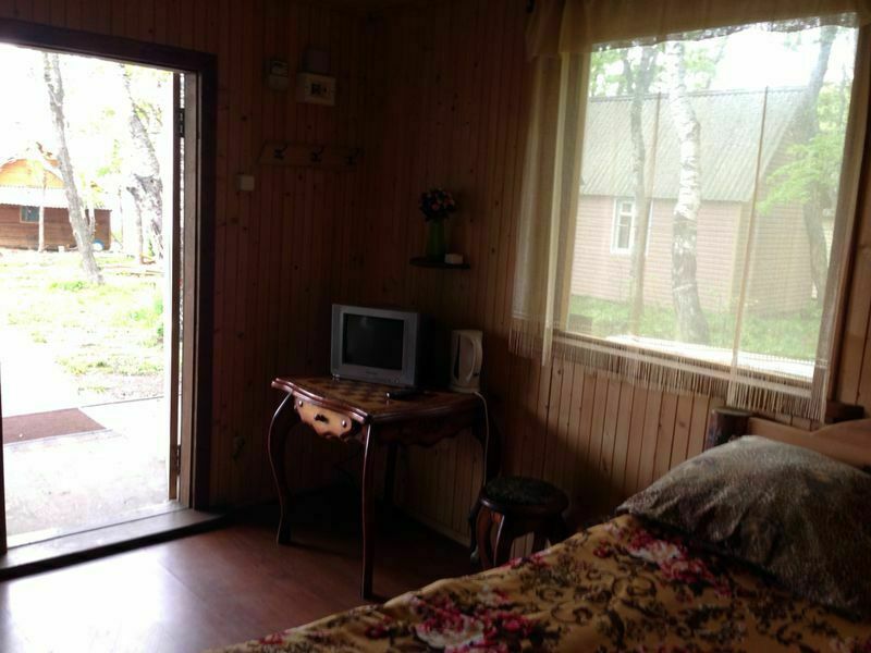В домике есть двуспальная и полутороспальная кровати, холодильник, телевизор, чайник, стол, стулья, тумбочки или комод.