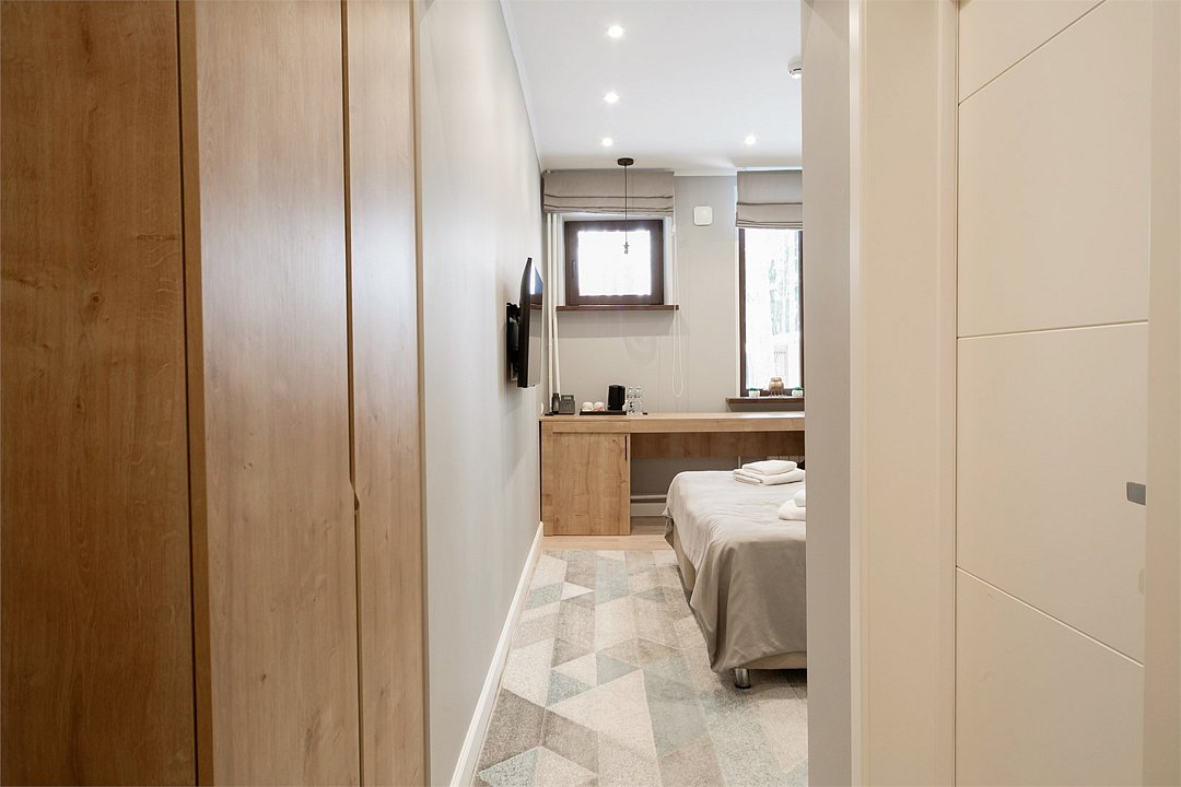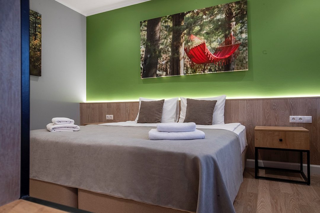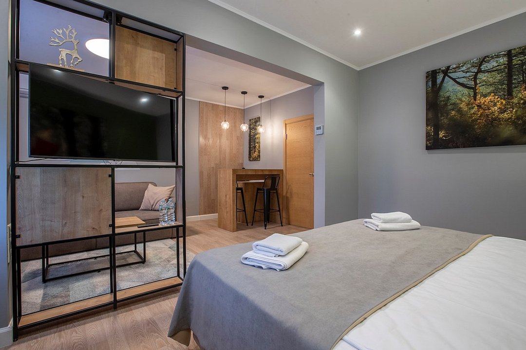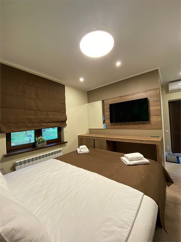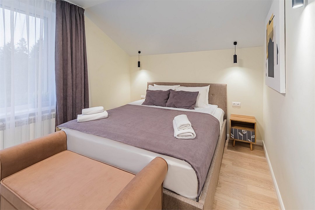 Apartaments 3 предназначены для совместного проживания с Apartments 1, между апартаментами предусмотрена межкомнатная дверь. В апартаментах имеется двуспальная кровать с матрасом премиум-качества, а также кресло и телевизор Smart TV - уютное место для вечернего отдыха, чтения или просмотра фильмов. Ванная комната оснащена белоснежной ванной и всеми необходимыми аксессуарами. Из окон апартаментов открывается живописный вид на лес, который позволяет полностью погрузиться в атмосферу гармонии с природой. Вместимость - до 2 человек Площадь 25 кв мУслуги и удобства