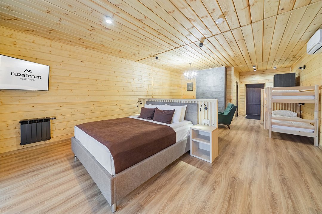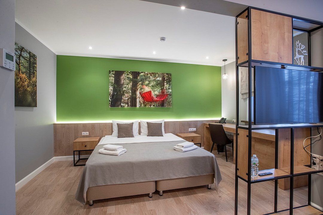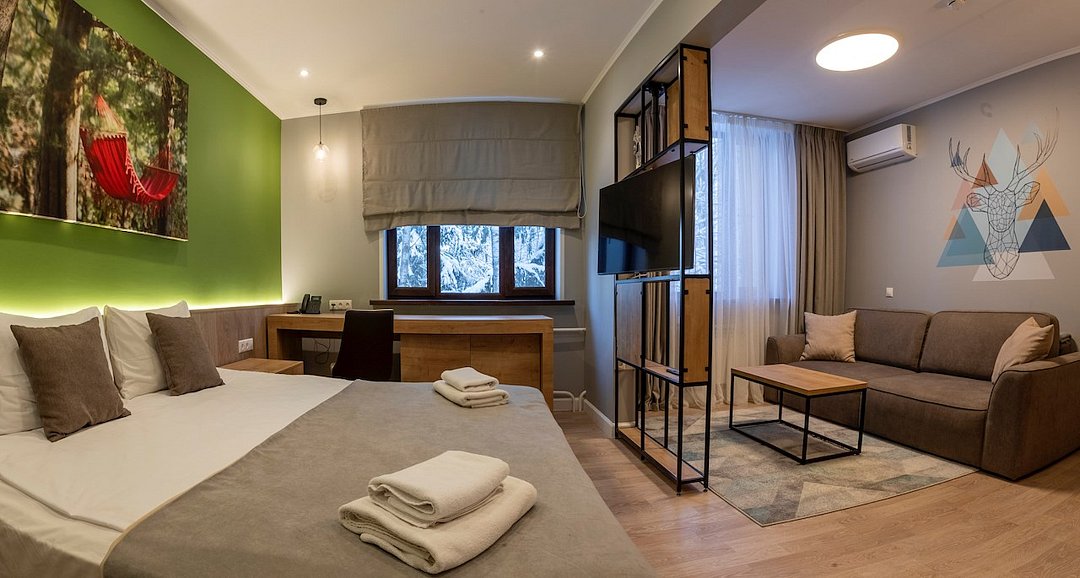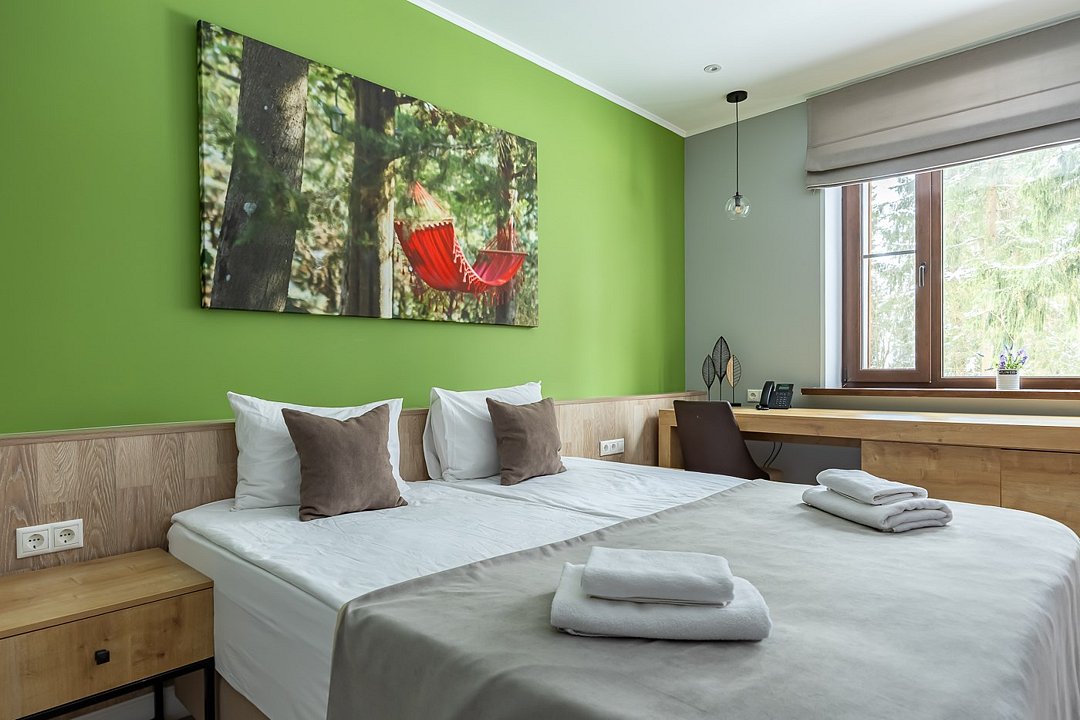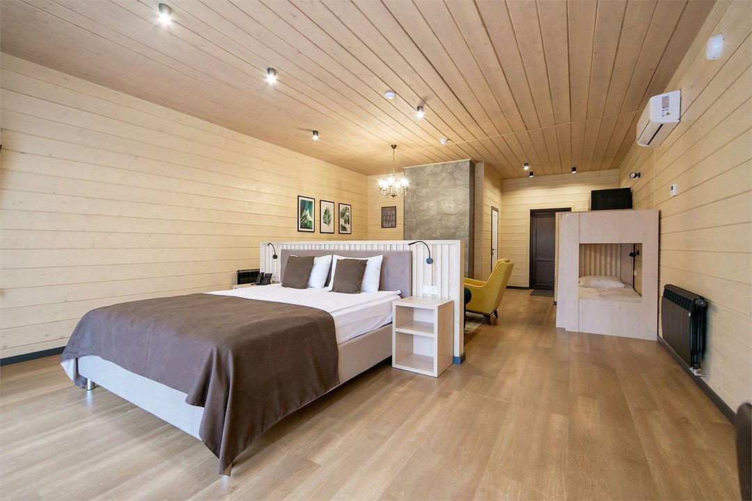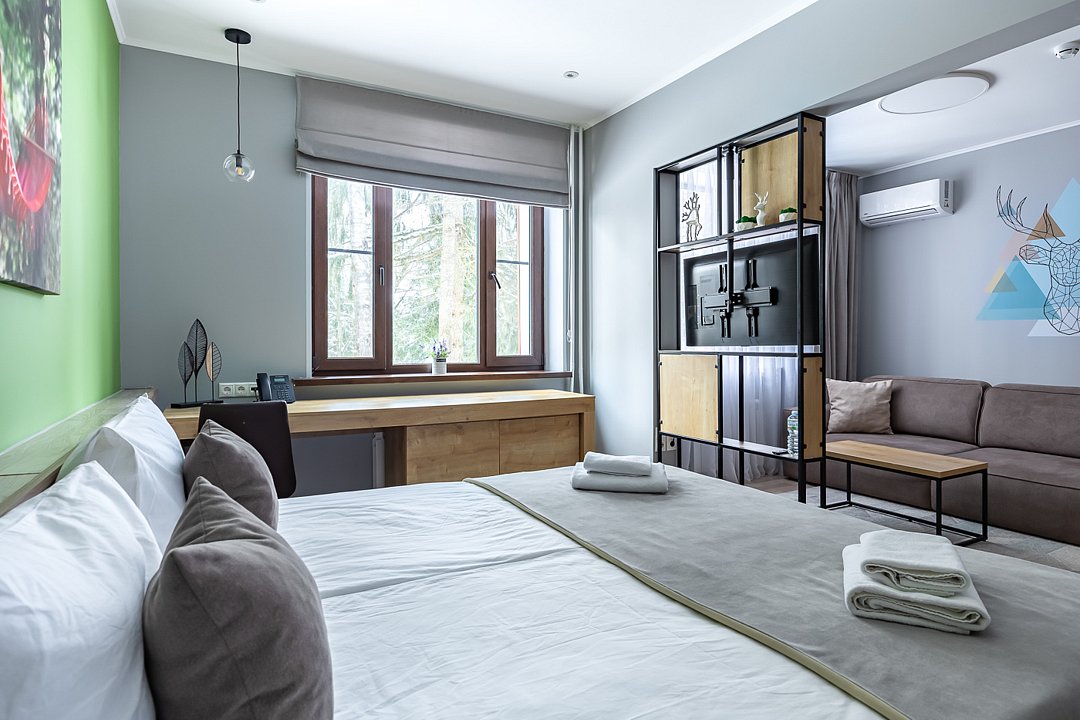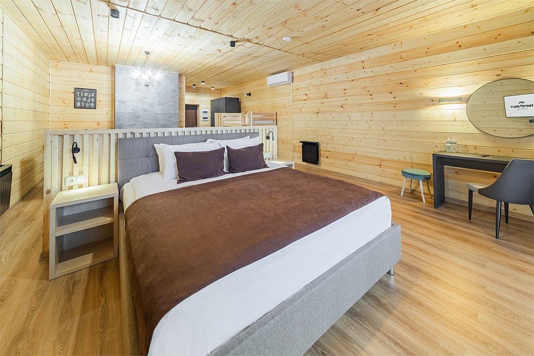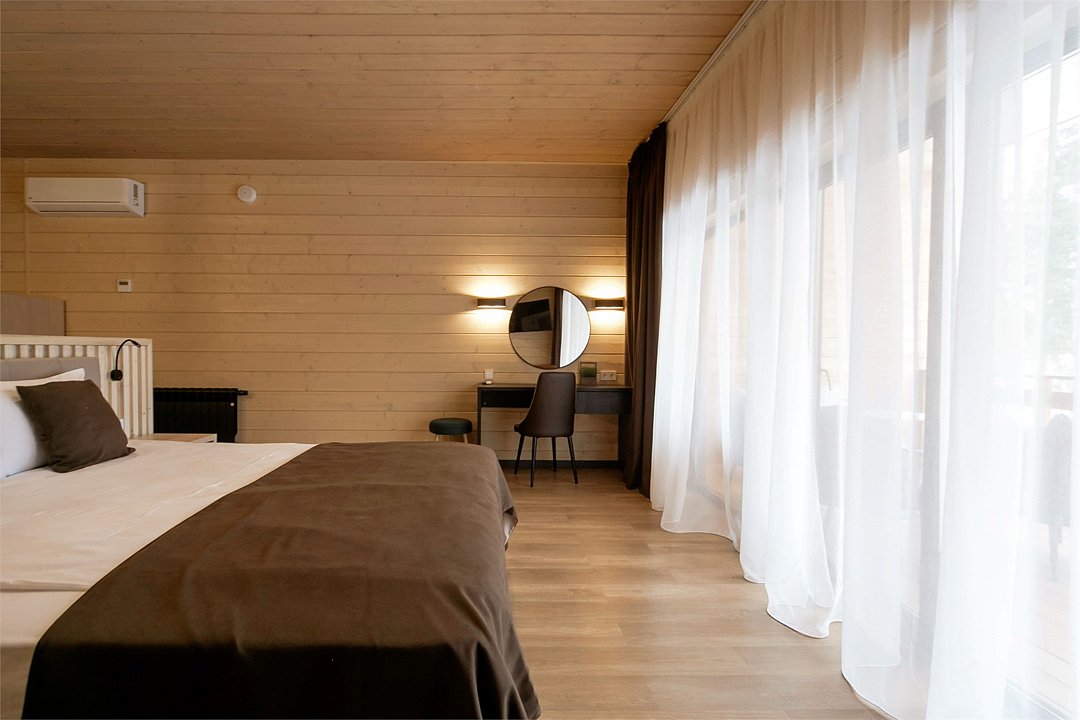 Wi-Fi, холодильник, кондиционер, фен, душевая кабина, теплый пол, банные принадлежности, халаты, банные полотенца, тапочки, гигиенические средства, две односпальные или большая двуспальная кровать, диван, тумбы, стулья, шкаф для одежды, вешалки, письменный стол, зеркало, чайный набор, чайник, унитаз, раковина, отопление, туалетные средства, туалет, диван-кровать, телевизор со Smart TV, вид на лес, гигиенический душ, шапочка для душа, мыло, можно с питомцамиВ гостиничном номере