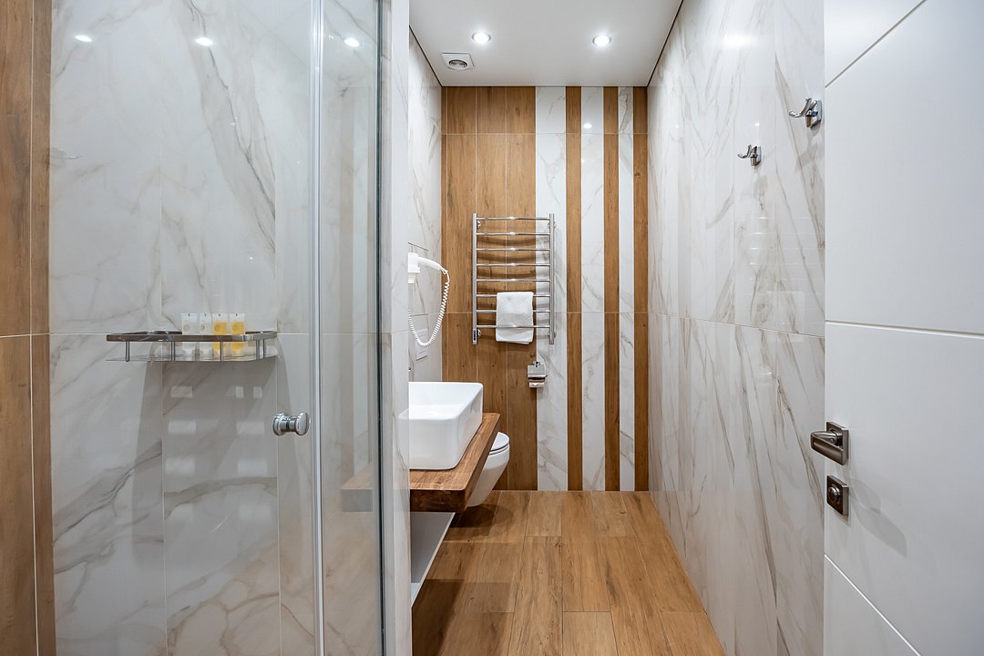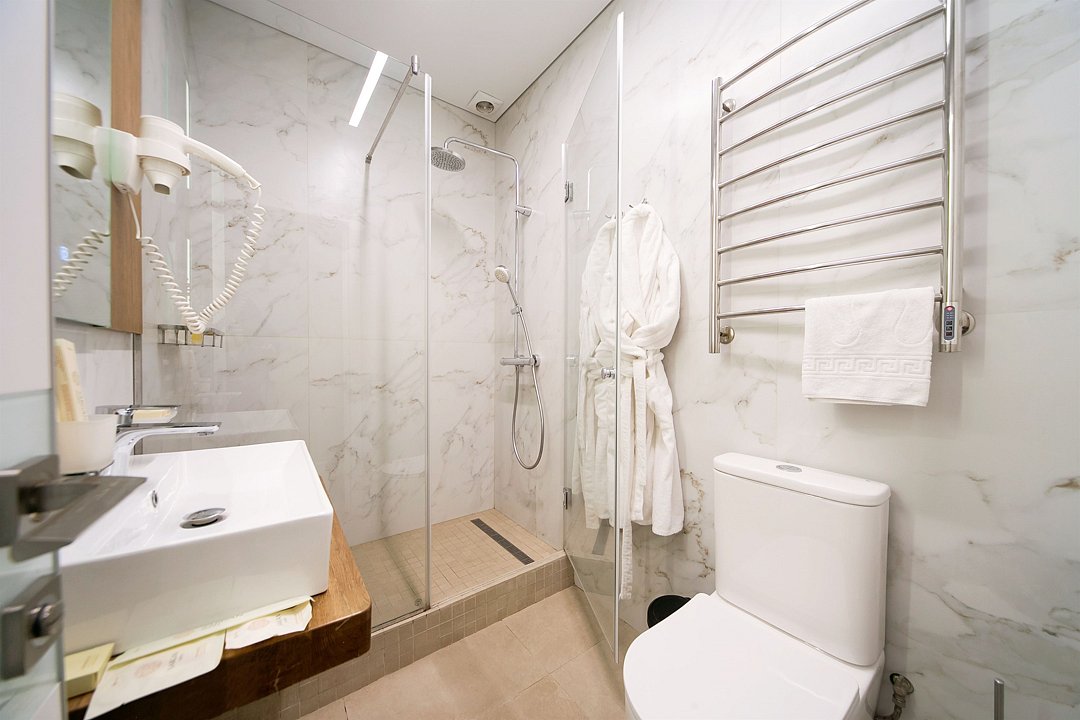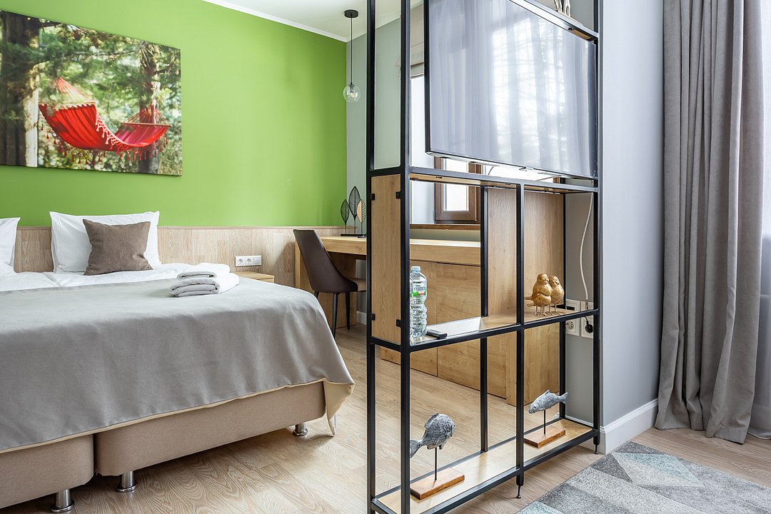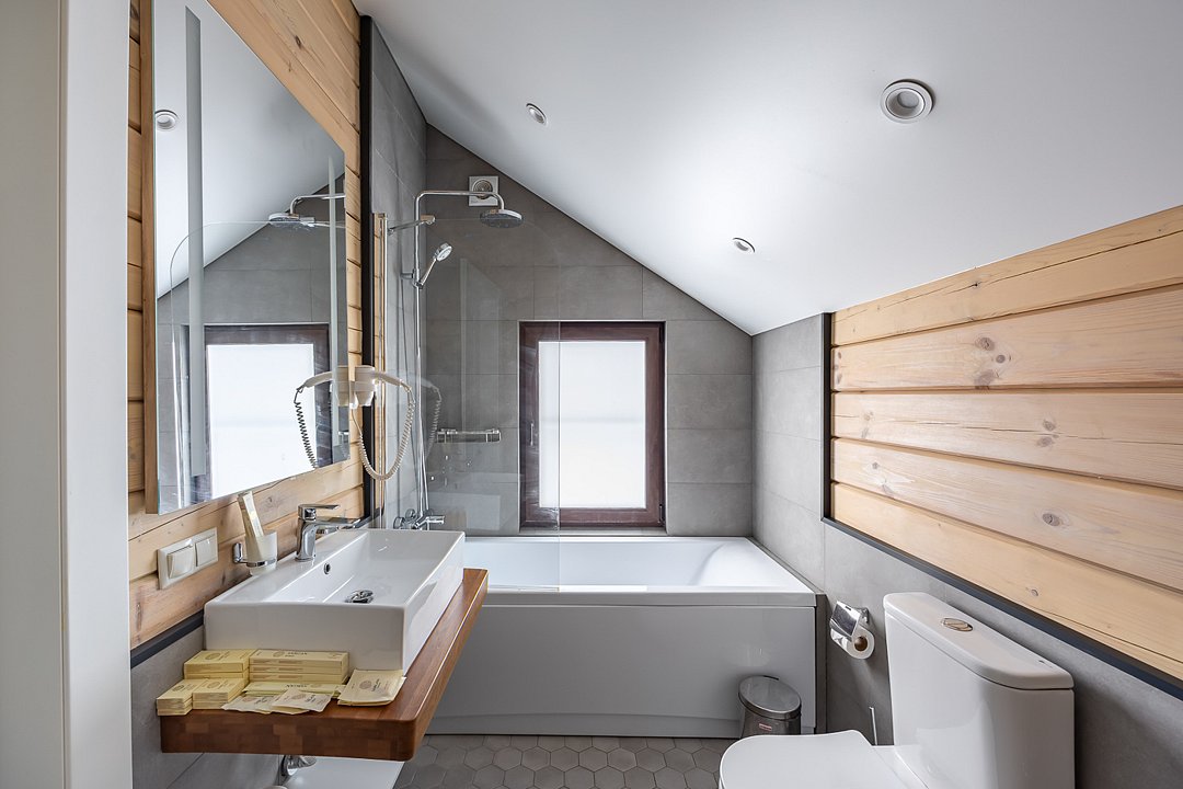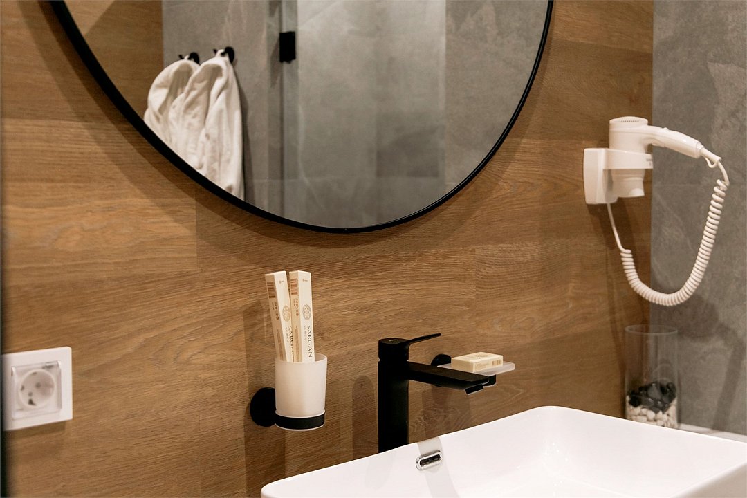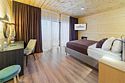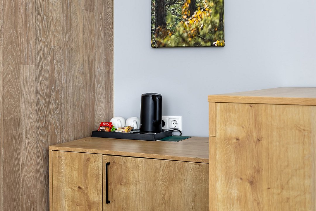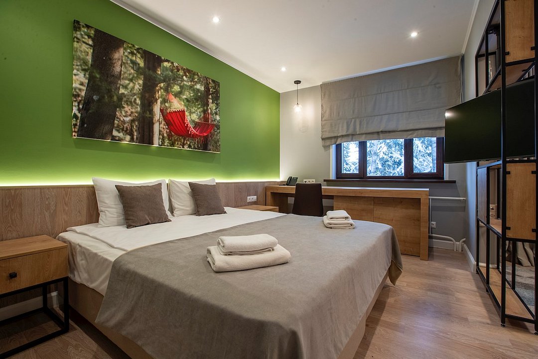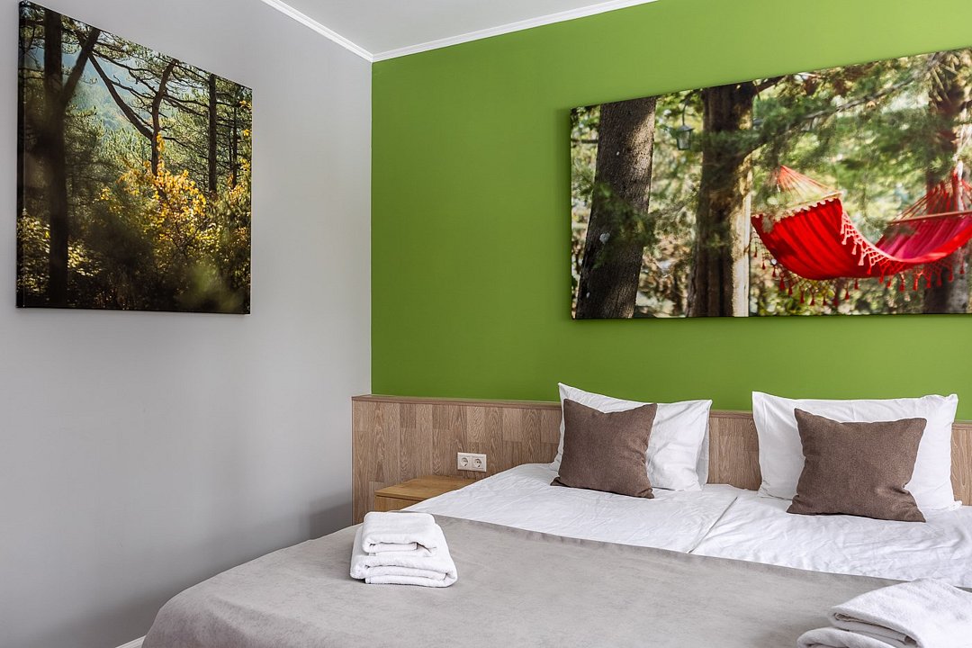 Wi-Fi, холодильник, кондиционер, фен, душевая кабина, теплый пол, банные принадлежности, халаты, банные полотенца, тапочки, гигиенические средства, две односпальные или большая двуспальная кровать, диван, тумбы, стулья, шкаф для одежды, вешалки, письменный стол, зеркало, чайный набор, чайник, унитаз, раковина, отопление, туалетные средства, туалет, диван-кровать, телевизор со Smart TV, вид на лес, гигиенический душ, шапочка для душа, мыло, можно с питомцамиВ гостиничном номере