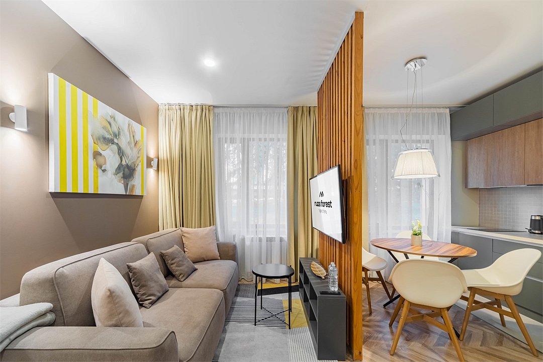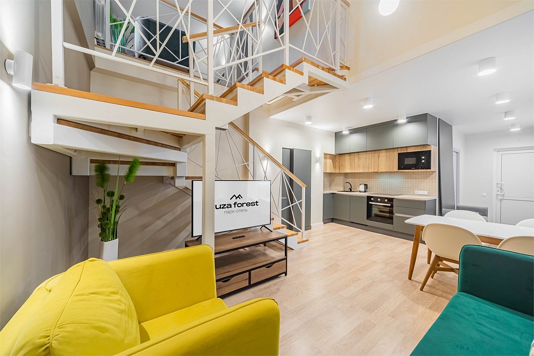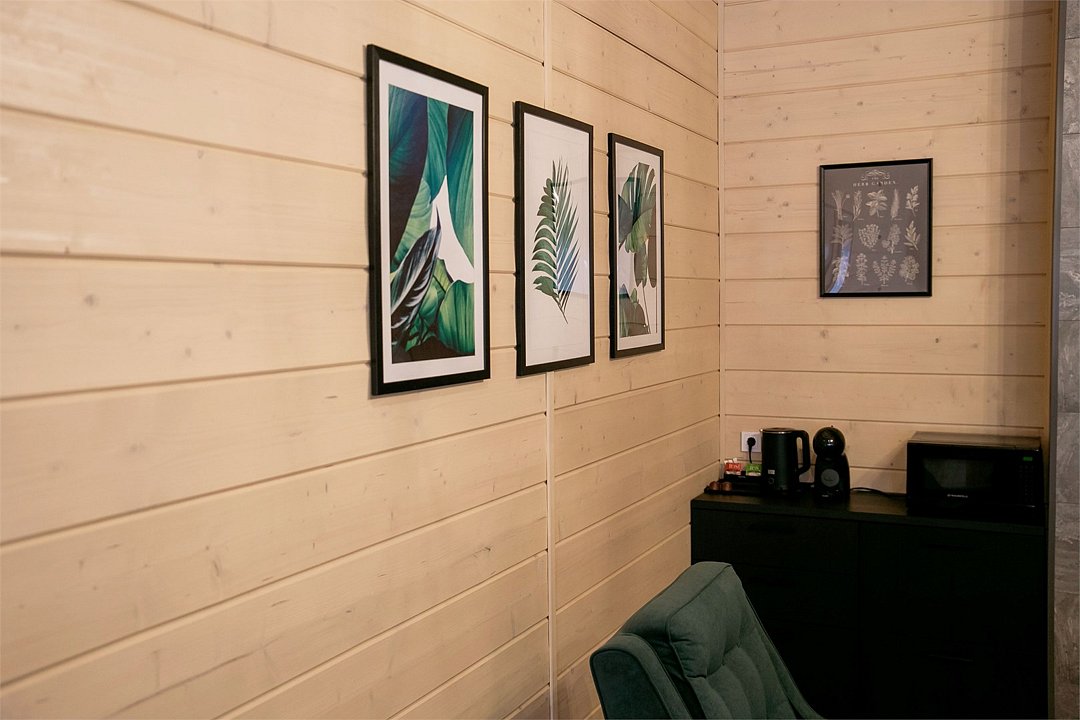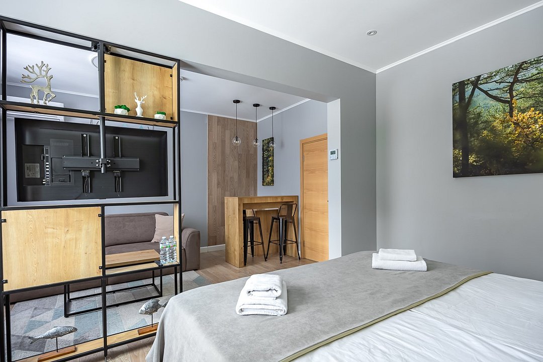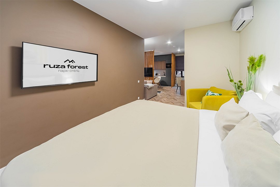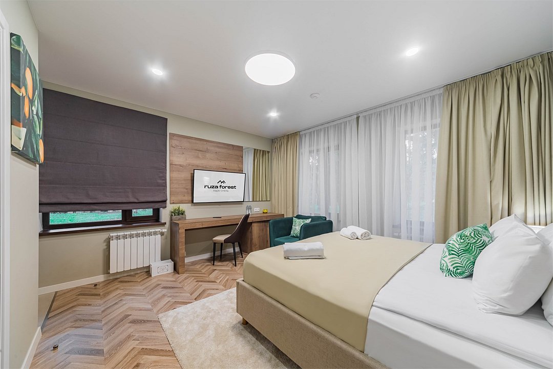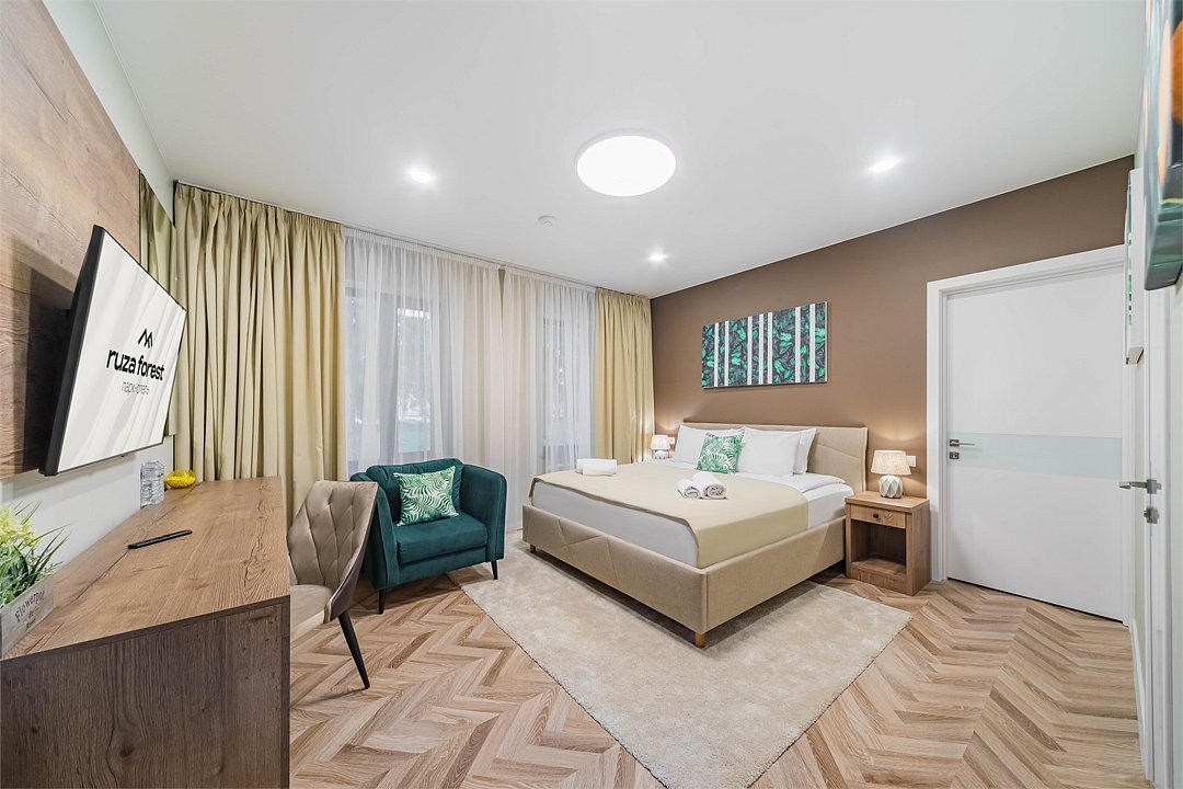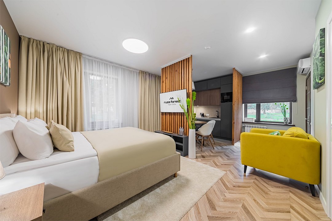 Apartments 1 расположены в окружении живописного Рузского леса и предлагают комфорт для полноценного отдыха вдали от городской суеты. Уникальный стильный дизайн интерьера создаёт уютную атмосферу и располагает к спокойствию и отдыху. В апартаментах предусмотрена спальная зона с двуспальной кроватью с матрасом премиум качества, обеспечивающим полноценный отдых, а также полностью оснащённая кухня для приготовления любимых блюд. Гостиная с мягким креслом, которая гармонично объединена с кухонной зоной. Для удобства гостей предусмотрен высокоскоростной интернет, телевизор Smart TV и ванная комната с душем, банными принадлежностями, халатами и тапочками. Из окон открывается завораживающий вид на лес - утром можно наслаждаться свежим воздухом и пением птиц, а вечером - умиротворением и тишиной. По желанию апартаменты можно объединить с соседним номером, создав единое пространство для комфортного отдыха большой компании или семьи. Площадь - 30 м². Вместимость - до 2 человек.Услуги и удобства