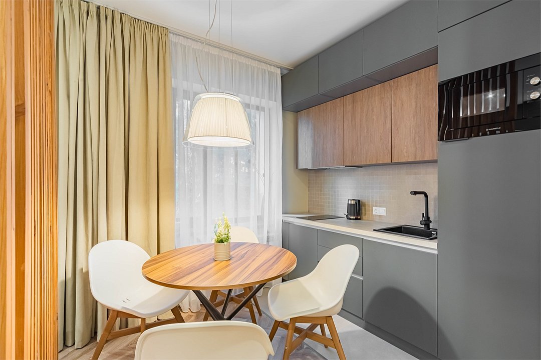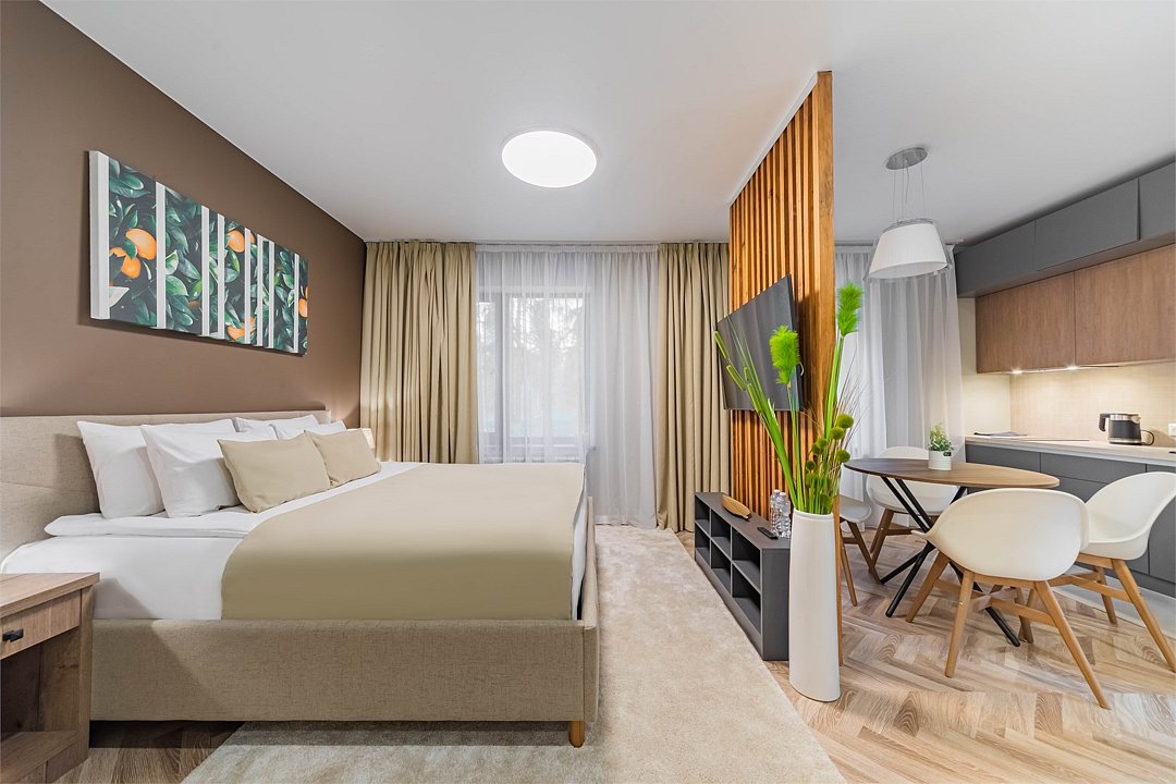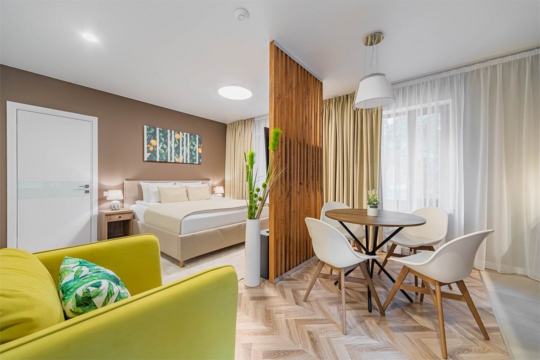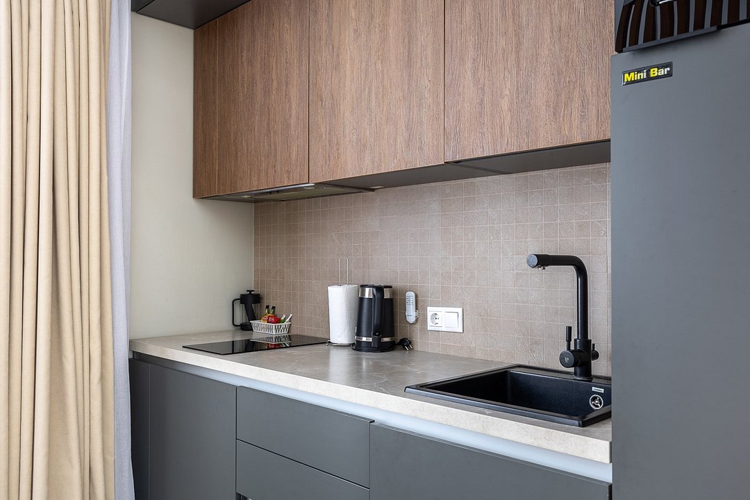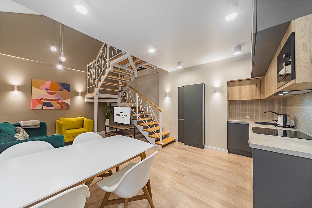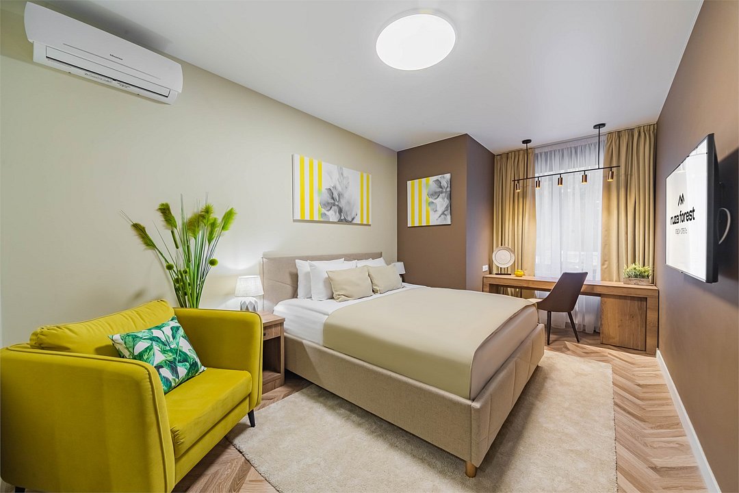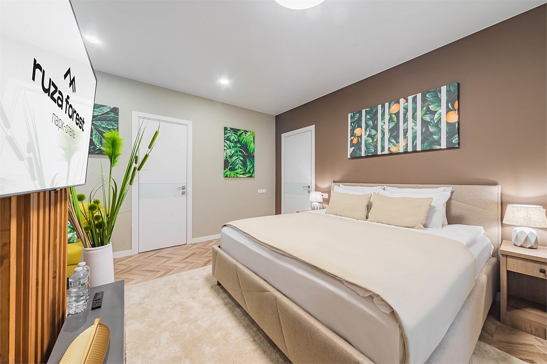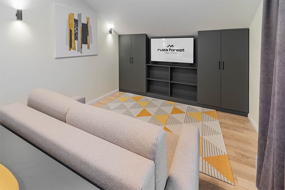 Apartments 1 расположены в окружении живописного Рузского леса и предлагают комфорт для полноценного отдыха вдали от городской суеты. Уникальный стильный дизайн интерьера создаёт уютную атмосферу и располагает к спокойствию и отдыху. В апартаментах предусмотрена спальная зона с двуспальной кроватью с матрасом премиум качества, обеспечивающим полноценный отдых, а также полностью оснащённая кухня для приготовления любимых блюд. Гостиная с мягким креслом, которая гармонично объединена с кухонной зоной. Для удобства гостей предусмотрен высокоскоростной интернет, телевизор Smart TV и ванная комната с душем, банными принадлежностями, халатами и тапочками. Из окон открывается завораживающий вид на лес - утром можно наслаждаться свежим воздухом и пением птиц, а вечером - умиротворением и тишиной. По желанию апартаменты можно объединить с соседним номером, создав единое пространство для комфортного отдыха большой компании или семьи. Площадь - 30 м². Вместимость - до 2 человек.Услуги и удобства