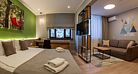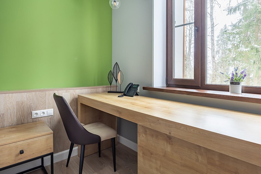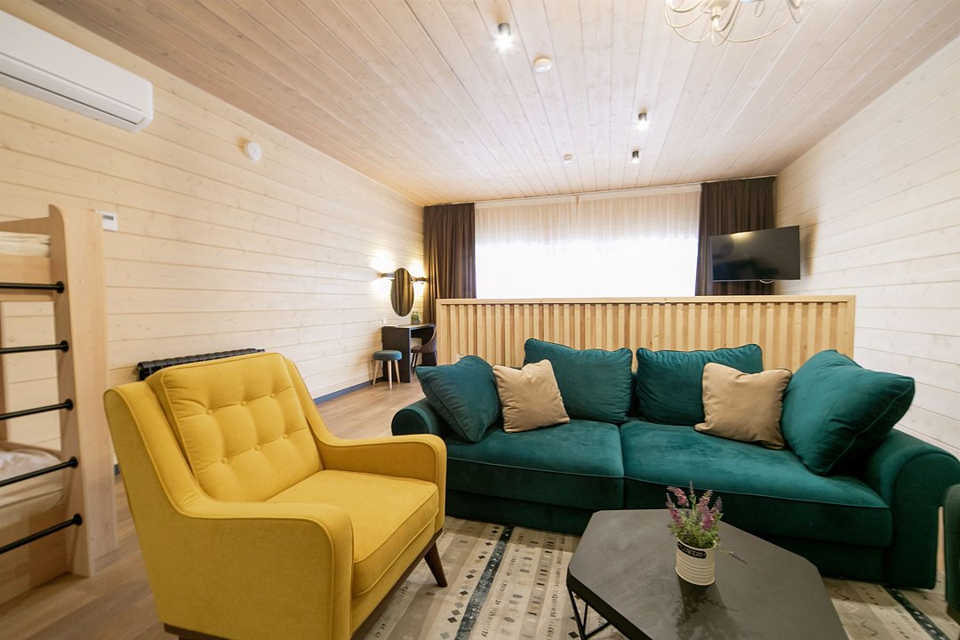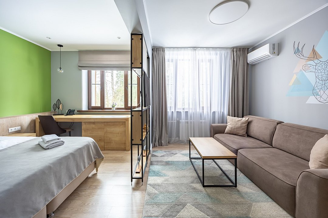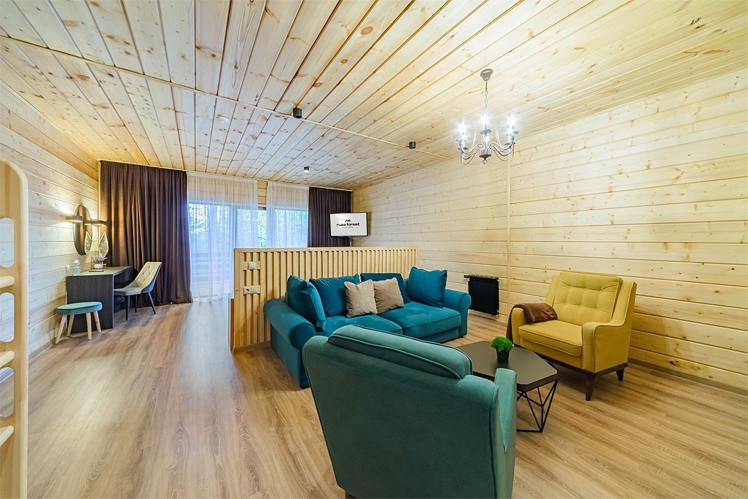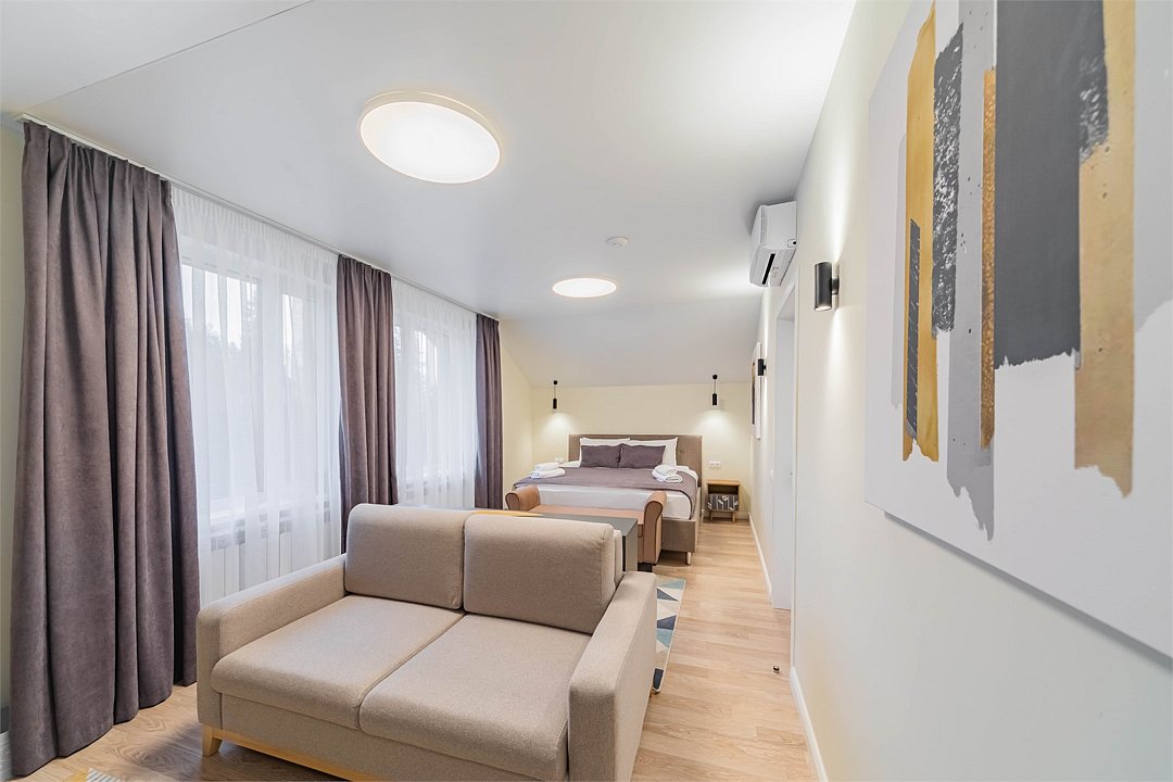 Стандартный номер - это чуть больше пространства, больше воздуха и ещё больше ощущения отдыха. Номер подойдёт для пары, семьи или небольшой компании. Тёплая цветовая палитра интерьера создаёт спокойную атмосферу, а продуманная планировка позволяет чувствовать себя свободно и комфортно. Из окон открывается вид на лес. Днём пространство наполнено естественным светом, а зелёный пейзаж за стеклом создаёт ощущение уединённости и настоящего загородного отдыха. Дополнительный диван делает размещение гибким и удобным - можно комфортно разместиться вдвоём или вчетвером. Санузел с душевой кабиной дополняет ощущение аккуратного, продуманного пространства. Площадь - 35 м². Вместимость - до 4 человек.Услуги и удобства