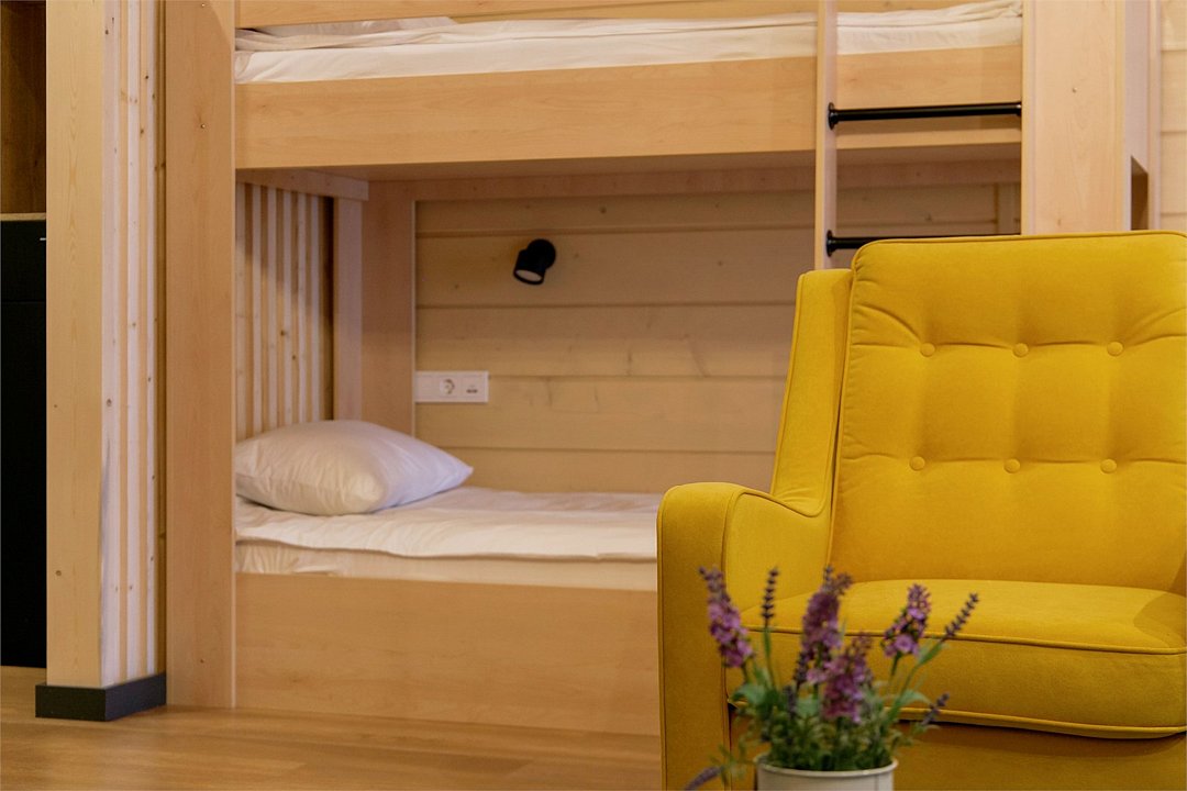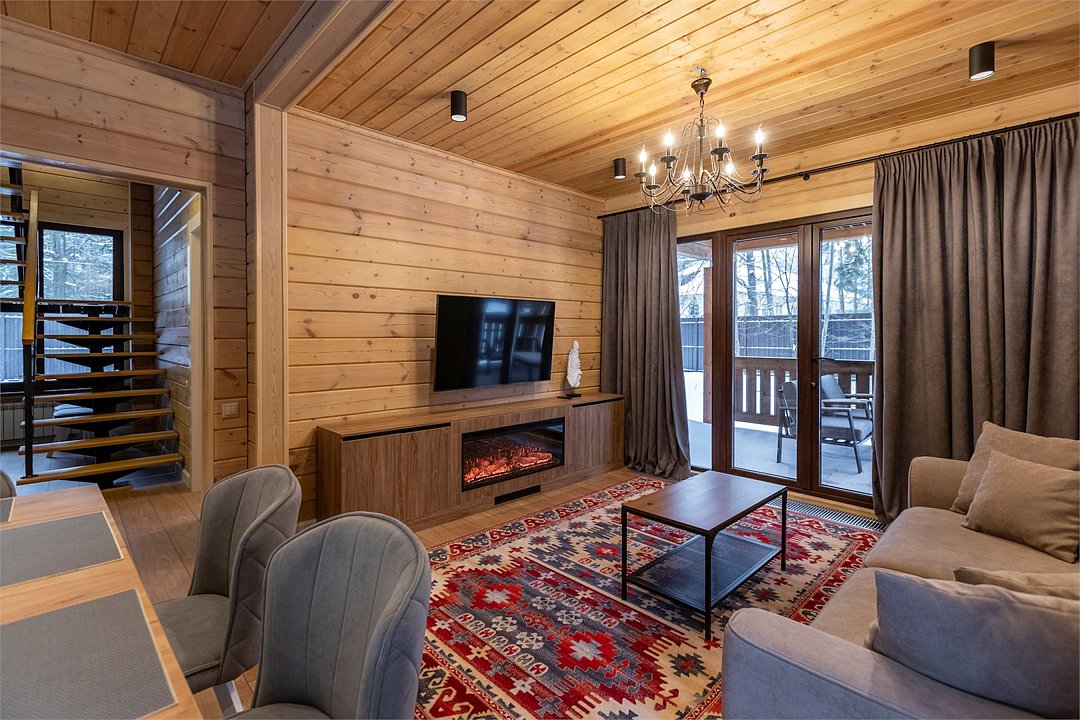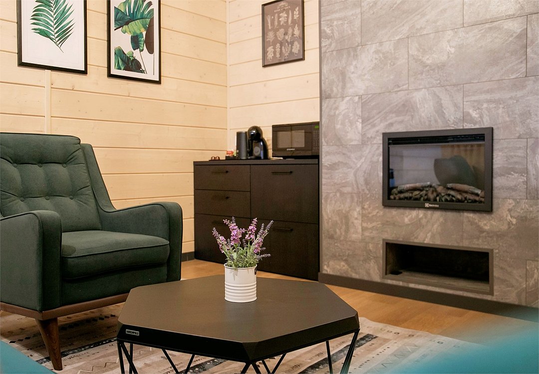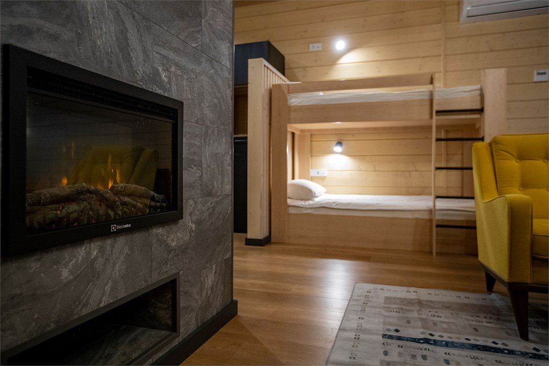 Barnhouse - это формат «ничего лишнего, только уют». Небольшой тёплый - номер, в который хочется возвращаться после долгих прогулок и активного дня. Пространство одноэтажное и очень гармоничное: спальная зона аккуратно отделена от гостиной, где расположен камин. Вечером здесь собираются все - кто-то устраивается с книгой, кто-то включает фильм, а кто-то просто наслаждается живым теплом и спокойной атмосферой. Размещение продумано для семьи или компании до шести человек: двуспальная кровать, двухъярусная кровать и раскладывающийся диван позволяют комфортно разместиться каждому. В доме есть компактная, но уютная кухонная зона. Утренний кофе, лёгкий завтрак или простой домашний ужин готовятся легко и без суеты. Именно тот формат кухни, который дополняет отдых, а не отвлекает от него. Санузел с душевой кабиной и тёплым полом добавляет приятного комфорта в любое время года. Терраса и лоджия открывают вид на природу и реку. Площадь Barnhouse - 50 м². Вместимость - до 6 человекУслуги и удобства