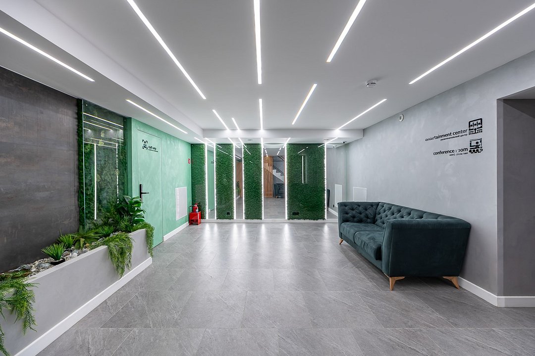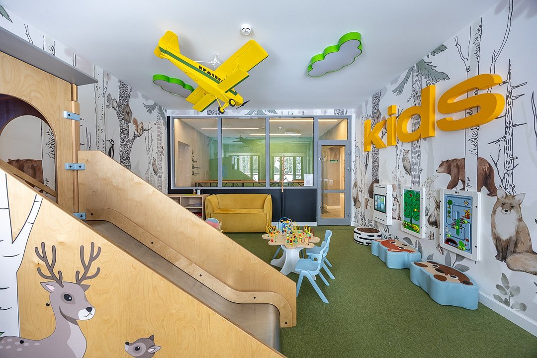 Детская площадка оборудована качелями, горками и лабиринтами, что позволяет детям не только играть, но и развиваться физически, а мягкое покрытие создает дополнительную защиту.