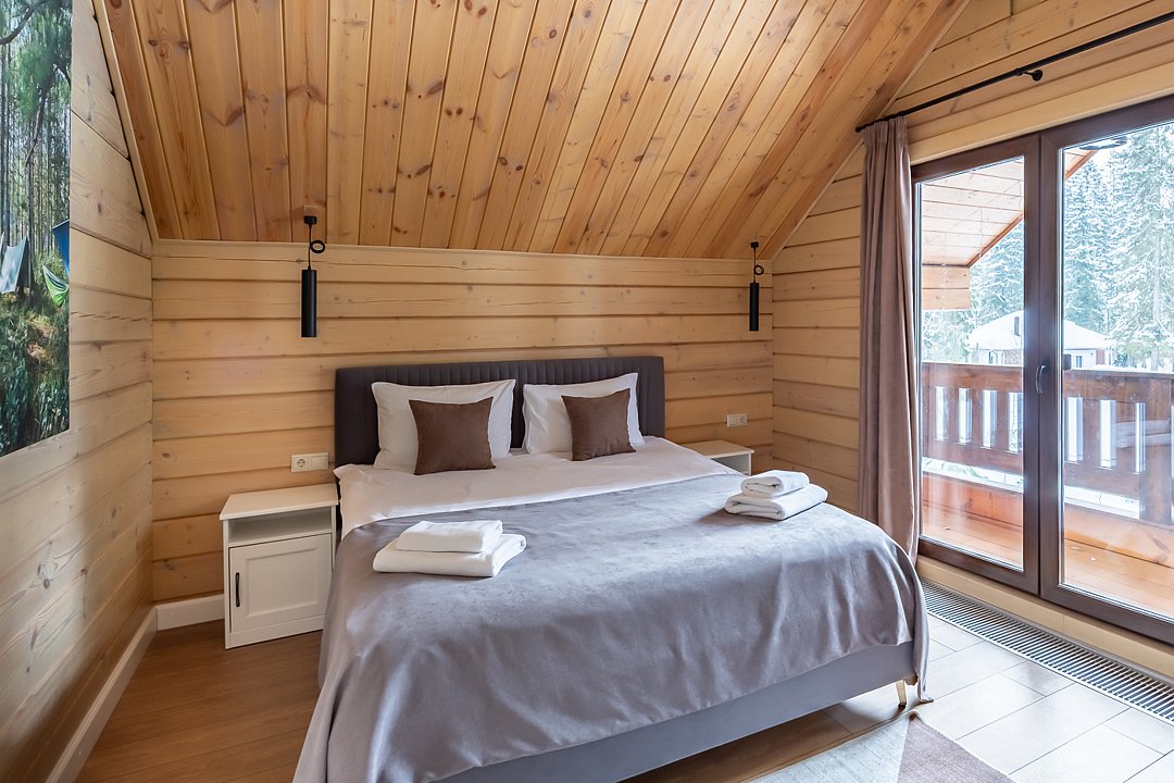 Это уже не просто номер - это настоящий загородный дом, где отдых начинается с ощущения простора. Cottage создан для тех, кто любит собираться вместе: большой семьёй или шумной компанией друзей. Двухэтажное пространство продумано так, чтобы каждому было комфортно. На первом этаже - центр притяжения: уютная гостиная с мягкой мебелью и камином. Здесь приятно собираться вечерами, разговаривать, играть в настольные игры или просто наслаждаться общением. Просторная кухня объединена с обеденной зоной - можно готовить любимые блюда и сразу подавать их к большому столу, где хватает места для всех. На этом же уровне расположена отдельная спальня - для тех, кому важно побыть в одиночестве. Рядом отдельный санузел с душевой кабиной. Второй этаж - более спокойный. Здесь находятся ещё три спальни. Утром в комнатах особенно тихо: мягкий свет, вид на природу за окном и ощущение настоящего загородного отдыха. На этаже - просторная ванная, где можно расслабиться после активного дня. Снаружи - собственная мангальная зона, балкон и свежий воздух. Тот самый формат отдыха, когда можно весь день проводить на улице, а вечером возвращаться в тёплый дом. В выходные дни бронирование Cottage возможно от двух суток. Площадь - 120 м². Вместимость - до 8 человек.Услуги и удобства