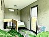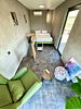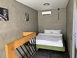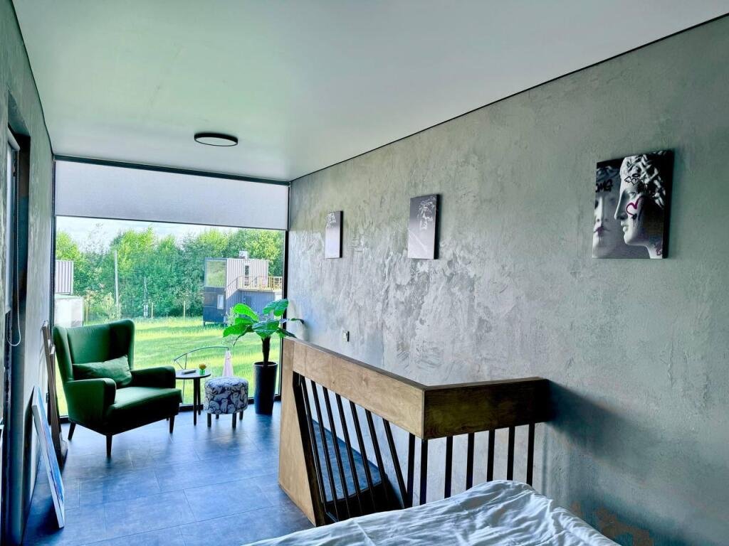 Второй этаж оснащен двуспальной парящей кроватью с ортопедическим матрасом средней жесткости, размером 160*200см., рейлингом для одежды, уютным креслом, пуфом и журнальным столиком.