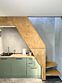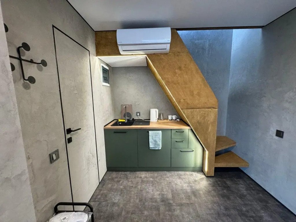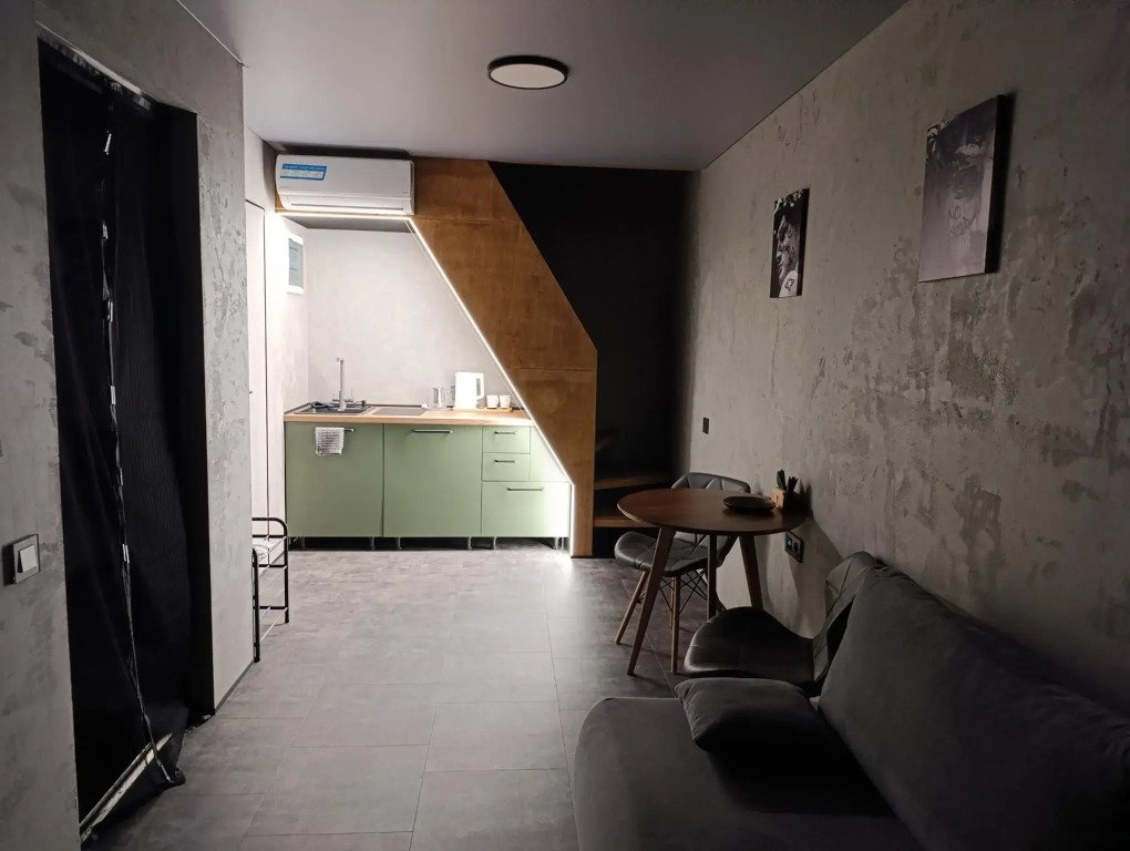 Первый этаж полностью оборудованная мини кухня с посудой и приборами для приготовления и приёма пищи, индукционная плита, мини-бар (оплачивается отдельно), набор для приготовления чая и кофе. Вместительный стол с удобными стульями, за которым может расположиться вся семья.