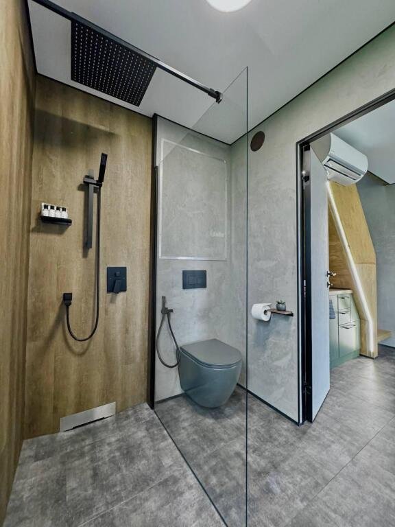 Ванная комната оборудована душевой кабиной с тропическим душем, большой удобной раковиной и унитазом инсталляцией с гигиеническим душем.