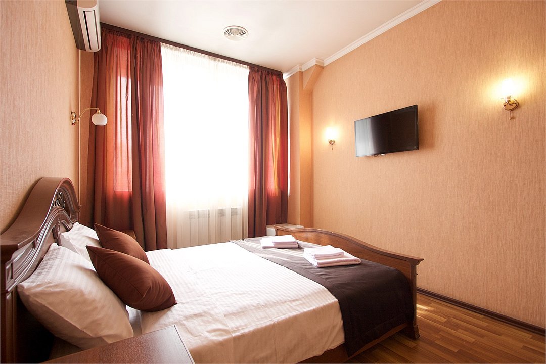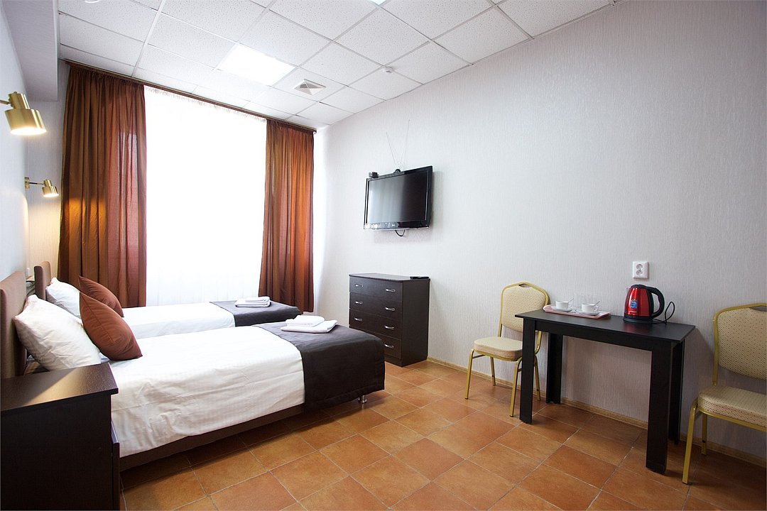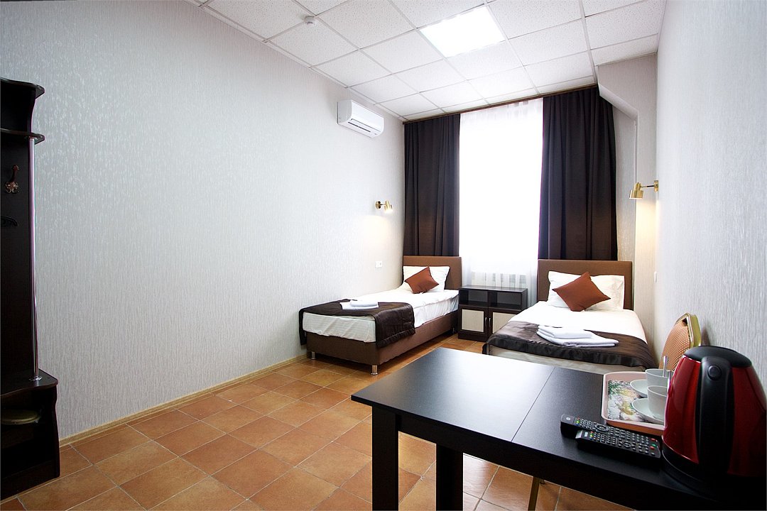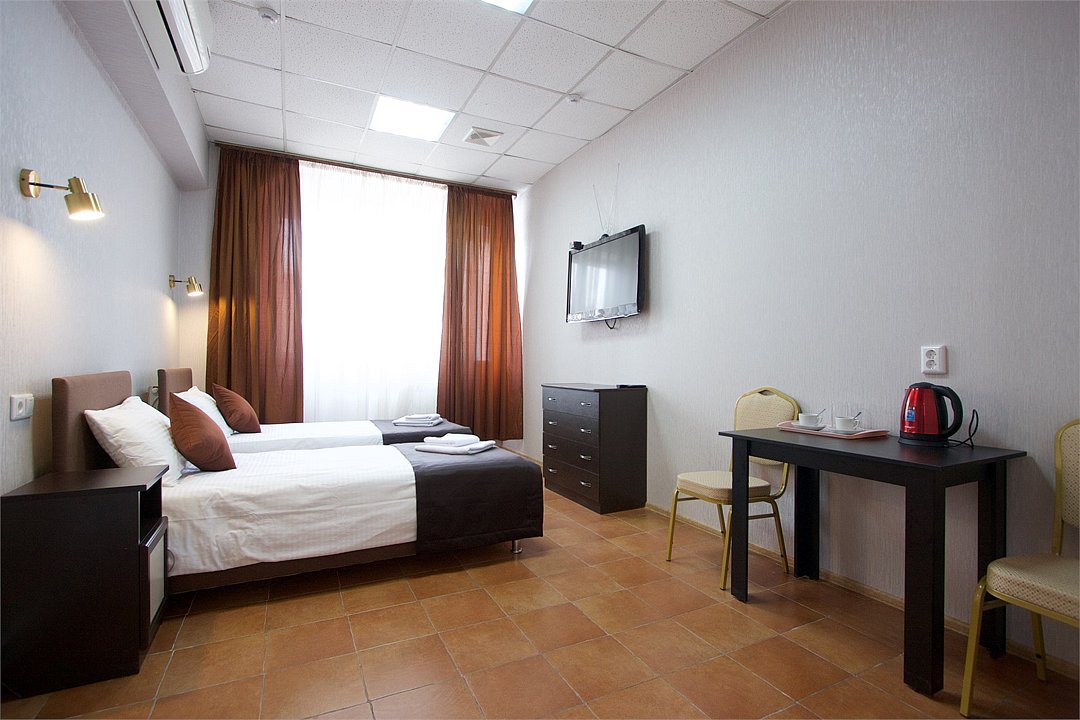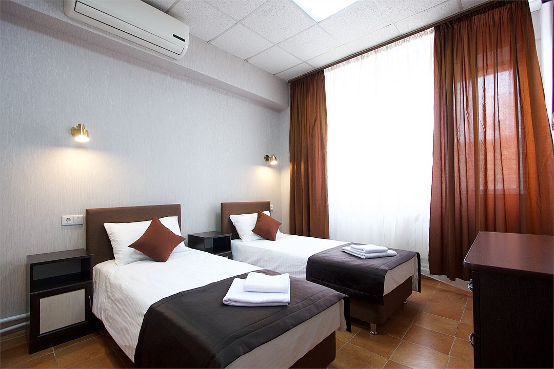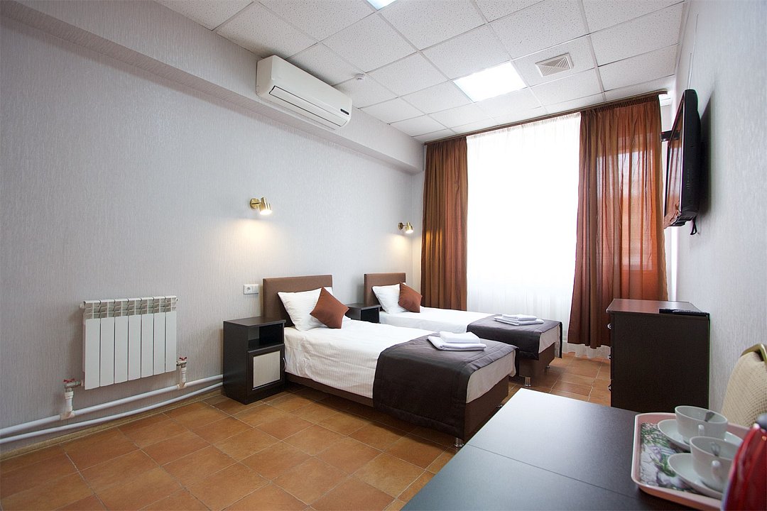 Бюджетный двухместный номер. Две односпальные кровати или одна двуспальная кровать, телевизор с плоским экраном, холодильник, кондиционер, Wi-Fi , собственный туалет и душ, электрический чайник, фен, средства личной гигиены, тапочки, доставка питания в номер. Размещение: 1-местное, 2-местное Дети до 12 лет, без предоставления дополнительного спального места, проживают в номере - бесплатно.Услуги и удобства